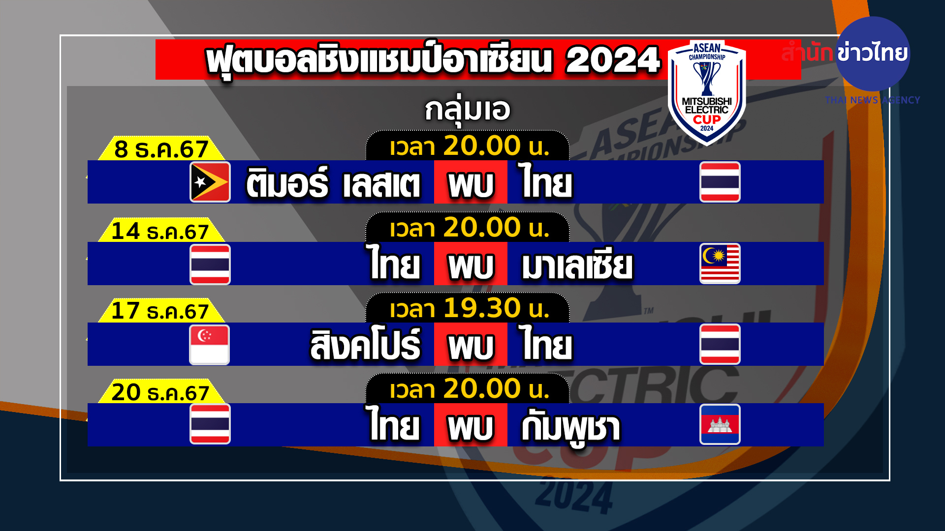 8 ธ.ค.- ทีมชาติไทย สถิติเหนือ ติมอร์ เลสเต ก่อนพบกันในเกมประเดิมสนามศึกฟุตบอลชิงแชมป์อาเซียน 2024 ค่ำนี้ 20.00 น.