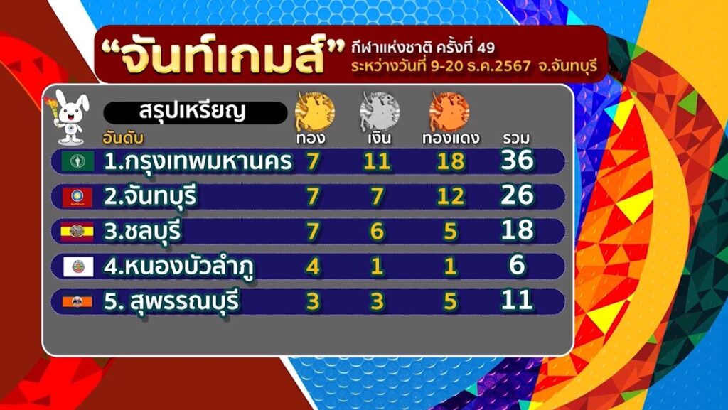 สรุปเหรียญทองล่าสุด กรุงเทพมหานคร ขยับขึ้นมานำเป็นอันดับที่ 1 คว้ามาได้ 7 เหรียญทอง 11 เหรียญเงิน และ 18 เหรียญทองแดง ตามมาด้วย เจ้าภาพ จันทบุรี 7 เหรียญทอง อันดับ 3 ชลบุรี 7 เหรียญทอง อันดับ 4 หนองบัวลำภู 4 เหรียญทอง และ อันดับ 5 สุพรรณบุรี 3 เหรียญทอง .-สำนักข่าวไทย