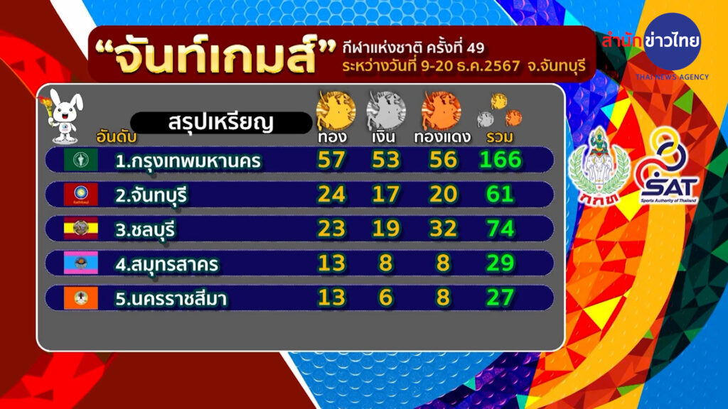 สรุปเหรียญทองล่าสุด กทม. นำเป็นอันดับที่ 1 บนตารางเหรียญ คว้ามาได้ 57 เหรียญทอง 53 เหรียญเงิน และ 56 เหรียญทองแดง ตามมาด้วย เจ้าภาพ จันทบุรี 24 เหรียญทอง อันดับ 3 ชลบุรี 23 เหรียญทอง อันดับ 4 สมุทรสาคร 13 เหรียญทอง และอันดับ 5 นครราชสีมา 13 เหรียญทอง .-สำนักข่าวไทย
