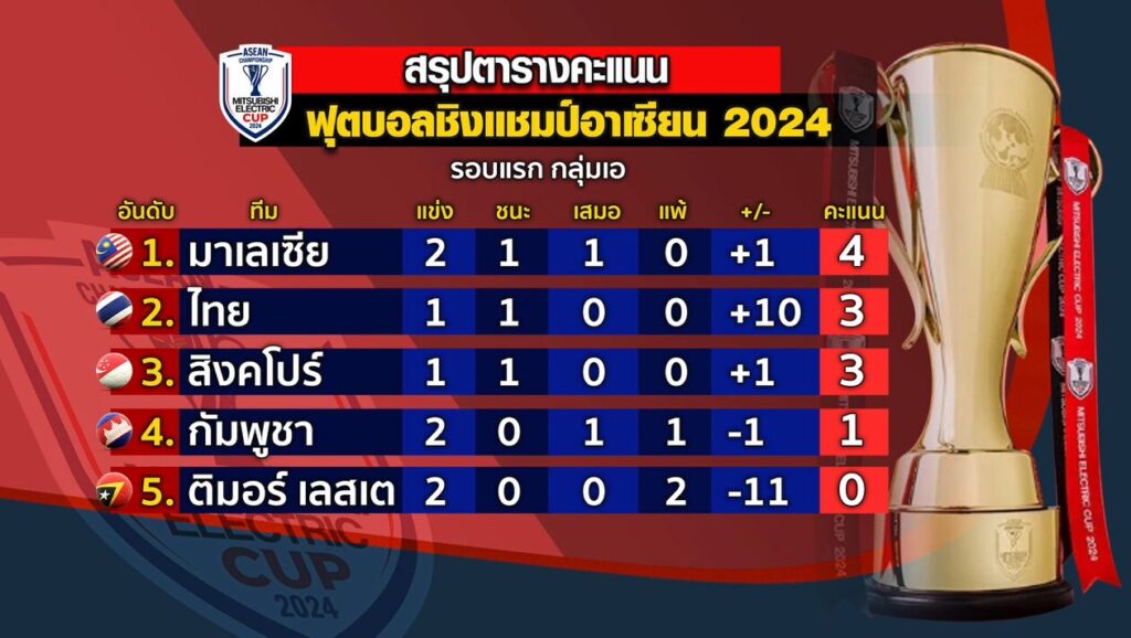 ฟุตบอลชิงแชมป์อาเซียน 2024 หรือ ASEAN Mitsubishi Electric Cup 2024 รอบแบ่งกลุ่ม กลุ่มเอ ทีมชาติไทย อันดับ 97 ของโลก อันดับ 2 ของกลุ่ม ที่นัดแรก ชนะติมอร์ เลสเต มา 10-0 จะลงสนามนัดที่สอง พบกับ ทีมชาติมาเลเซีย ทีมจ่าฝูงของกลุ่ม ที่เกมแรกเสมอ กัมพูชามา 2-2 และนัดที่2 ชนะ ติมอร์ เลสเต มา 3-2 ในอีก 1 ชั่วโมงข้างหน้านี้ ที่สนามราชมังคลากีฬาสถาน