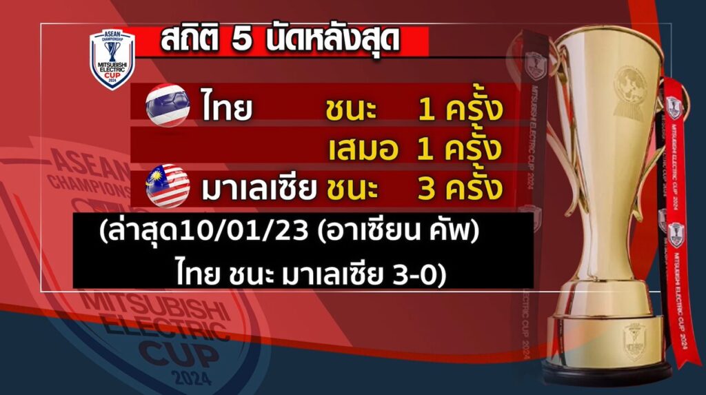สถิติ ทีมไทย กับ มาเลเซีย ในรายการนี้ 17 ครั้ง ไทย ชนะ 8 เสมอ 5 มาเลเซีย ชนะ 4 โดย 5 นัดหลังสุดที่พบกัน ไทย ชนะ 1 เสมอ 1 มาเลเซีย ชนะ 3 พบกันล่าสุดวันที่ 10 มกราคม 2023 ในศึกชิงแชมป์อาเซียน รอบรองชนะเลิศ ไทย ชนะ มาเลเซีย 3-0 .-สำนักข่าวไทย