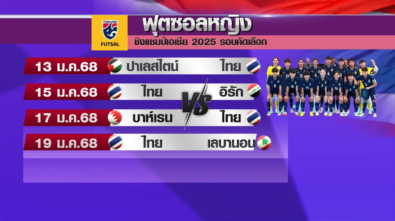 26 ธ.ค. – “ดาริกา เพียรภายลุน” เตรียมนำทีมนักเตะสาวโต๊ะเล็กทีมชาติไทย ลงทำศึกฟุตซอลหญิงชิงแชมป์เอเชีย 2025 รอบคัดเลือก เดือน ม.ค.นี้