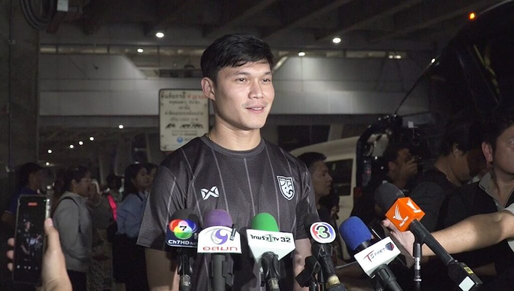 นักฟุตบอลทีมชาติไทยชุดใหญ่ นำโดย พีรดนย์ ฉ่ำรัศมี กัปตันทีม, ศุภณัฏฐ์ เหมือนตา, พาตริก กุสตาฟส์สัน เดินทางกลับถึงประเทศไทยเรียบร้อยแล้ว ที่สนามสุวรรณภูมิ ท่ามกลางแฟน ๆ ที่รอต้อนรับ หลังจากนักเตะทีมช้างศึกเพิ่งบุกไปแพ้เวียดนามมา 1-2 ในศึกฟุตบอลชิงแชมป์อาเซียน หรือ “อาเซียน มิตซูบิชิ อิเล็คทริค คัพ 2024” รอบชิงชนะเลิศ นัดแรก เมื่อวานนี้ ทำให้นัดที่ 2 ทีมช้างศึกต้องชนะเวียดนามด้วยผลต่าง 2 ประตูขึ้นไป จึงจะคว้าแชมป์ แต่หากไทยยิงชนะได้ผลห่าง 1 ประตู ต้องต่อเวลาพิเศษ