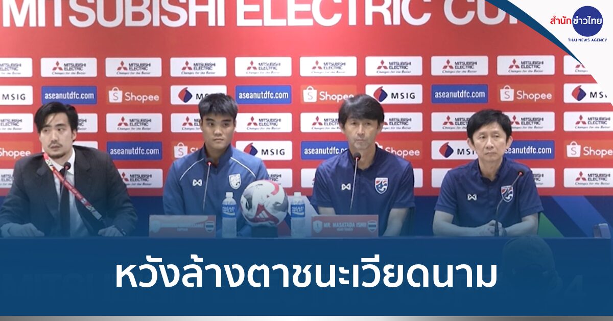 ความเคลื่อนไหวศึกฟุตบอลชิงแชมป์อาเซียน หรือ “อาเซียน มิตซูบิชิ อิเล็คทริค คัพ 2024” รอบชิงชนะเลิศ นัดที่ 2 ระหว่าง ทีมชาติไทย อดีตแชมป์ 7 สมัยและอันดับ 97 ของโลก พบ เวียดนาม อดีตแชมป์ 2 สมัยและอันดับ 114 ของโลก ที่จะมีขึ้นในค่ำวันพรุ่งนี้ (5 ม.ค.) หลังจากนัดแรก เวียดนาม เฉือนเอาชนะไปได้ 2-1 ล่าสุดเมื่อช่วงสายของวันนี้ ฝ่ายจัดการแข่งขันสหพันธ์ฟุตบอลอาเซียน หรือ AFF จัดแถลงข่าวก่อนเกม โดยทีมชาติไทย นำโดย มาซาทาดะ อิชิอิ เฮ้ดโค้ชทีมชาติไทย พร้อมด้วย พีรดนย์ ฉ่ำรัศมี กัปตันทีม