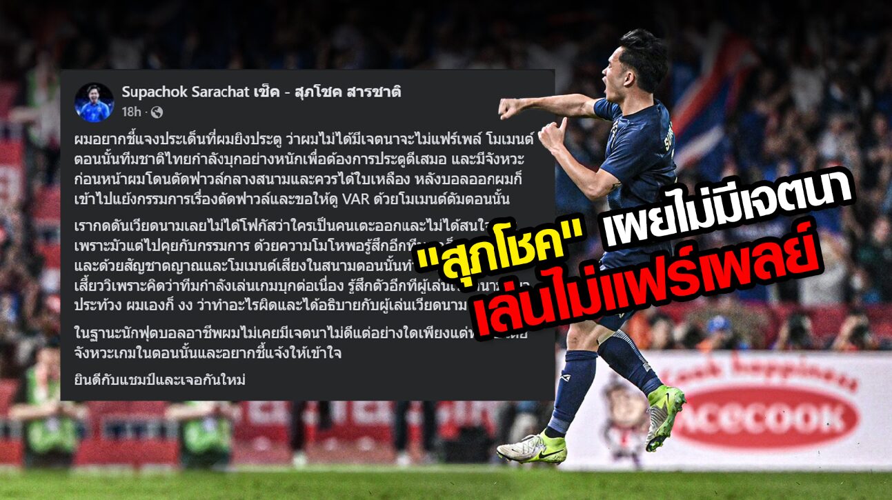 โดยสุภโชคเผยว่า ไม่มีเจตนาจะไม่แฟร์เพลย์โมเมนต์ตอนนั้น ทีมชาติไทยกำลังบุกอย่างหนักเพื่อต้องการประตูตีเสมอ เรากดดันเวียดนามเลยไม่ได้โฟกัสว่าใครเป็นคนเตะออก เพราะมัวแต่ไปคุยกับกรรมการ รู้สึกอีกทีบอลก็มาถึงตัวเอง และด้วยสัญชาตญาณและโมเมนต์เสียงในสนามตอนนั้นทำให้ตัดสินใจยิงในเสี้ยววินาที เพราะคิดว่าทีมกำลังเล่นเกมบุกต่อเนื่อง รู้สึกตัวอีกทีผู้เล่นเวียดนามก็มาประท้วง ตนเองก็งง ว่าทำอะไรผิดและได้อธิบายกับผู้เล่นเวียดนามไปแล้ว ในฐานะนักฟุตบอลอาชีพผมไม่เคยมีเจตนาไม่ดีแต่อย่างใด เพียงแต่ทำไปโดยจังหวะเกมในตอนนั้น และอยากชี้แจ้งให้เข้าใจ ยินดีกับแชมป์และเจอกันใหม่