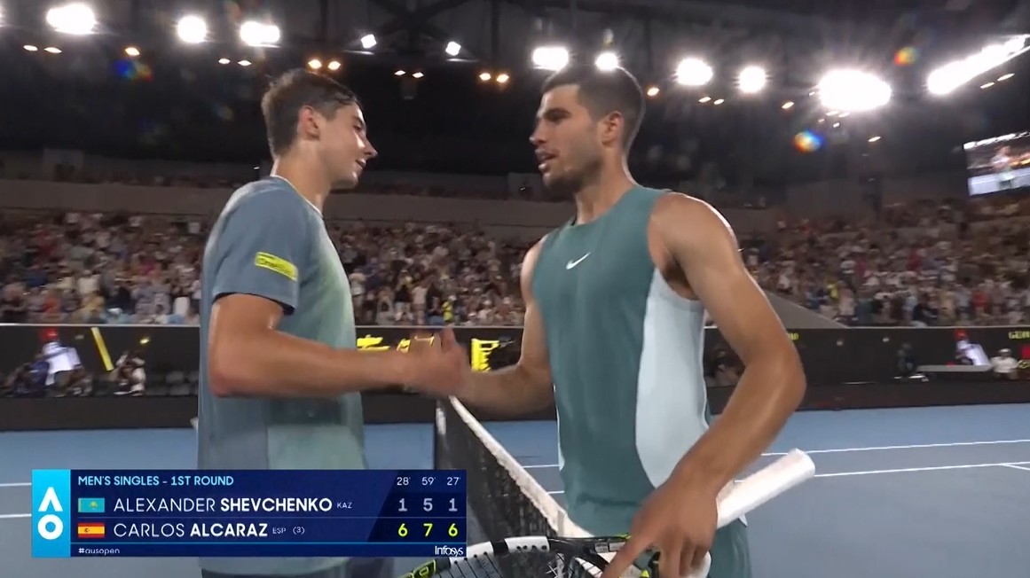 เทนนิสแกรนด์สแลมแรกของปี 2025 รายการออสเตรเลียน โอเพ่น ที่เมืองเมลเบิร์น ประเทศออสเตรเลีย ประเภทชายเดี่ยว รอบแรก คาร์ลอส อัลการาซ มือ 3 ของรายการ จากสเปน ฟอร์มร้อนแรง หวดเอาชนะ อเล็กซานเดอร์ เชฟเชนโก จากคาซัคสถาน 3 เซตรวด 6-1, 7-5 และ 6-1 ผ่านเข้ารอบ 2 ไปพบกับ โยชิฮิโตะ นิชิโอกะ จากญี่ปุ่น