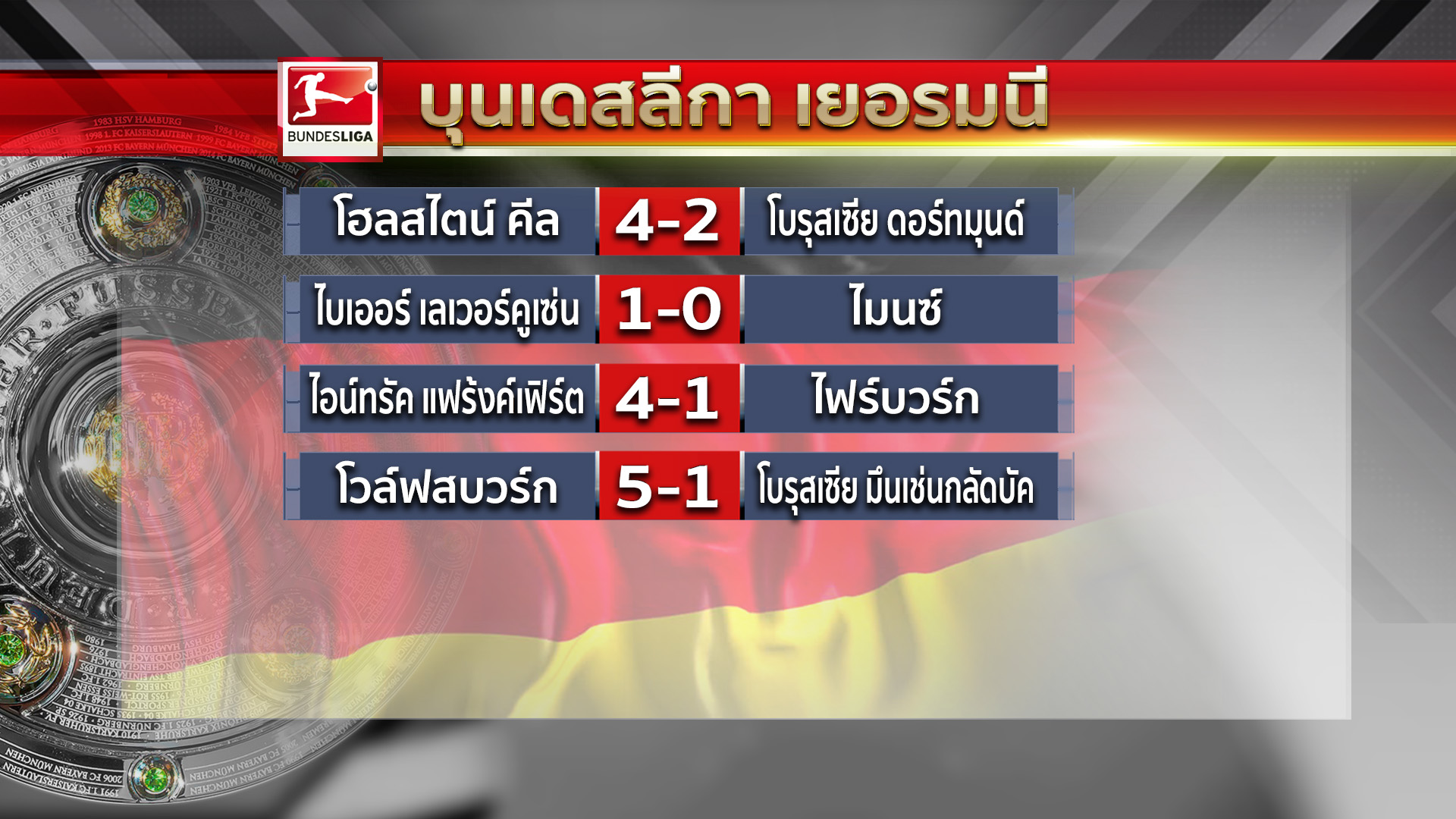 เยอรมนี 15 ม.ค. – โฮลสไตน์ คีล เอาชนะ ดอร์ทมุนด์ 4-2 ส่วนเลเวอร์คูเซน แชมป์เก่า เฉือนชนะ ไมนซ์ 1-0 ศึกบุนเดสลีกา เยอรมนี