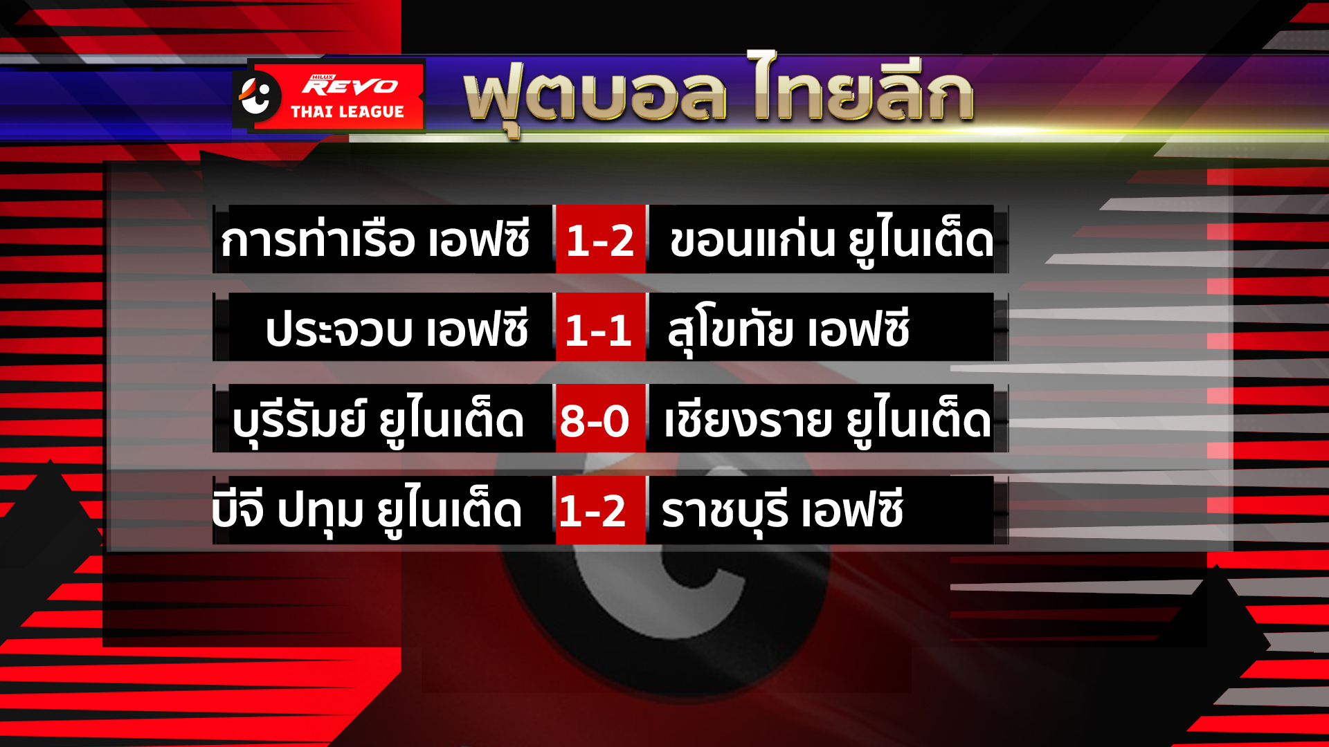 ผลอีก 2 คู่ การท่าเรือ เอฟซี แพ้ ขอนแก่น ยูไนเต็ด 1-2 และประจวบ เอฟซี เสมอ สุโขทัย เอฟซี 1-1 ด้านผลฟุตซอลหญิงชิงแชมป์เอเชีย 2025 รอบคัดเลือก กลุ่มเอ นัดที่ 2 นักเตะโต๊ะเล็กสาวไทย ถล่มชนะ อิรัก 7-1 เก็บชัยชนะ 2 นัดรวด.-สำนักข่าวไทย