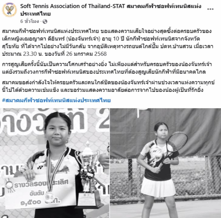 เหตุสลดครั้งนี้เกิดขึ้นหลัง “น้องจันทร์เจ้า” เดินทางมาร่วมการแข่งขันกีฬาซอฟท์เทนนิสชิงชนะเลิศจังหวัดปทุมธานี ประจำปี 2568 ระหว่างวันที่ 23-26 มกราคม และคว้ารองแชมป์หญิงเดี่ยว อายุไม่เกิน 12 ปี เป็นรางวัลสุดท้ายของชีวิต ซึ่งทางสมาคมกีฬาซอฟท์เทนนิสแห่งประเทศไทย แสดงความเสียใจอย่างสุดซึ้งกับครอบครัว นับเป็นการสูญเสียนักกีฬาที่มีอนาคตไกลอีก 1 ราย. – สำนักข่าวไทย