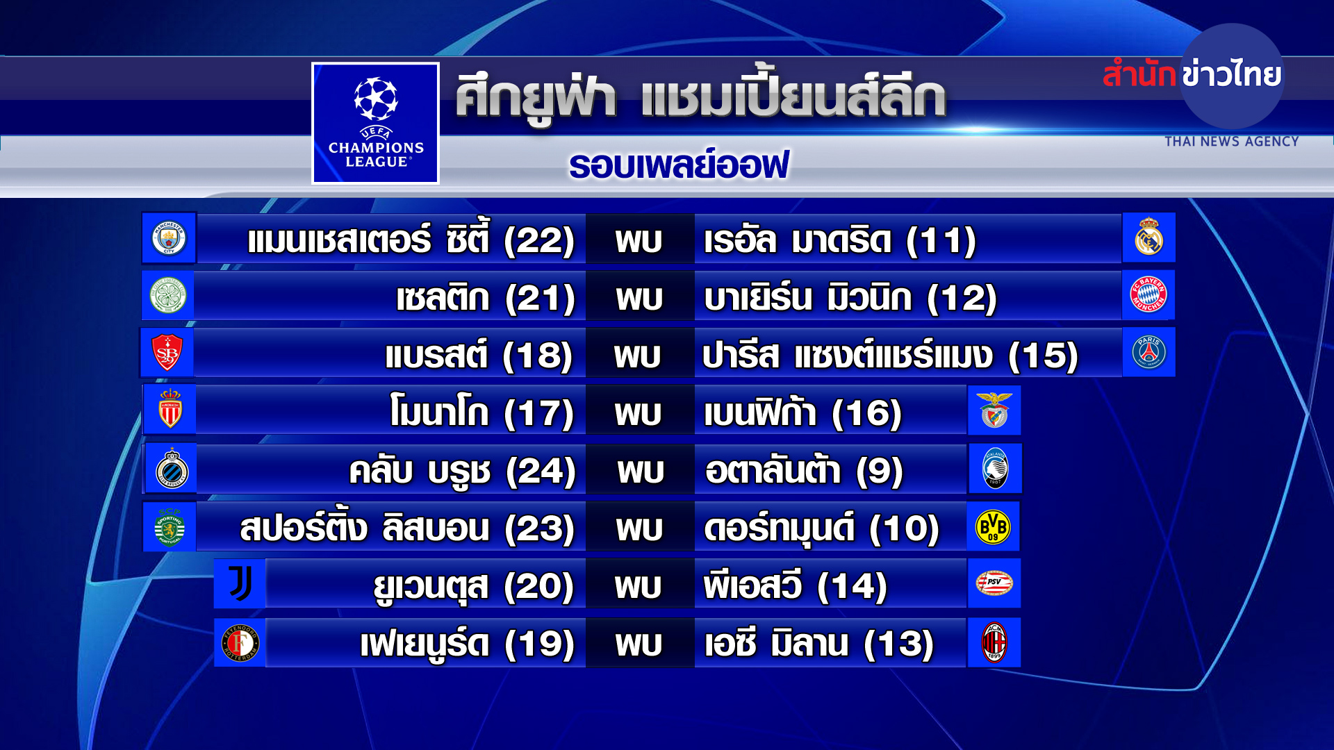 สหพันธ์ฟุตบอลยุโรป หรือ ยูฟ่า จับสลากประกบคู่ศึกยูฟ่า แชมเปียนส์ลีก รอบเพลย์ออฟ ระบบใหม่ ที่จะนำทีมอันดับ 9-24 ในรอบลีก มาแข่งขันแบบเหย้า-เยือน เพื่อหา 8 ทีมเข้าไปเล่นในรอบ 16 ทีมสุดท้าย ที่มีทีมอันดับ 1-8 ที่ได้เข้ารอบอัตโนมัติรออยู่แล้ว ผลปรากฏว่า คู่บิ๊กแมตช์ “ทีมเรือใบสีฟ้า” แมนเชสเตอร์ ซิตี้ อดีตแชมป์ปี 2023 จากอังกฤษ อันดับ 22 ต้องพบ “ทีมราชันชุดขาว” เรอัล มาดริด อันดับ 11 และอดีตแชมป์ยุโรป 15 สมัยจากสเปน โดยทีมชนะจะเข้ารอบ 16 ทีมสุดท้ายไปพบแอตฯ มาดริด จากสเปน หรือ เลเวอร์คูเซน จากเยอรมนี