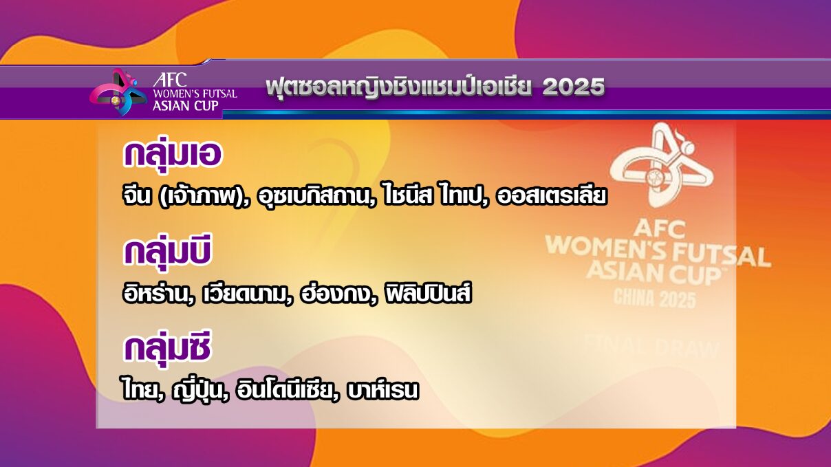 สมาพันธ์ฟุตบอลแห่งเอเชีย หรือ เอเอฟซี จัดพิธีจับสลากการแข่งขันฟุตซอลหญิงชิงแชมป์เอเชีย 2025 รอบสุดท้าย หรือ AFC Women’s Futsal Asian Cup 2025 ที่สาธารณรัฐประชาชนจีน ระหว่างวันที่ 7-18 พฤษภาคมนี้ ผลปรากฏว่า กลุ่มเอ – จีน (เจ้าภาพ), อุซเบกิสถาน, ไชนีส ไทเป, ออสเตรเลีย กลุ่มบี – อิหร่าน, เวียดนาม, ฮ่องกง, ฟิลิปปินส์ และ กลุ่มซี – ไทย, ญี่ปุ่น, อินโดนีเซีย, บาห์เรน