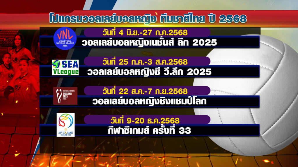 สำหรับการแข่งขันวอลเลย์บอลรายการนานาชาติ ของทีมนักตบหญิงไทย ที่จะแข่งขันในปี 2568 ประกอบไปด้วย การแข่งขัน วอลเลย์บอลหญิงเนชั่นส์ ลีก 2025 (FIVB Volleyball Women’s Nations League 2025) ระหว่างวันที่ 4 มิ.ย.-27 ก.ค. 2568 , การแข่งขันวอลเลย์บอลหญิงซี วี.ลีก 2025 ระหว่างวันที่ 25 ก.ค.-3 ส.ค.68 , การแข่งขันวอลเลย์บอลหญิงชิงแชมป์โลก (FIVB Volleyball World Championship Women) ระหว่างวันที่ 22 ส.ค.-7 ก.ย.68 และมหกรรมกีฬาซีเกมส์ ครั้งที่ 33 ระหว่างวันที่ 9-20 ธ.ค.68.-สำนักข่าวไทย