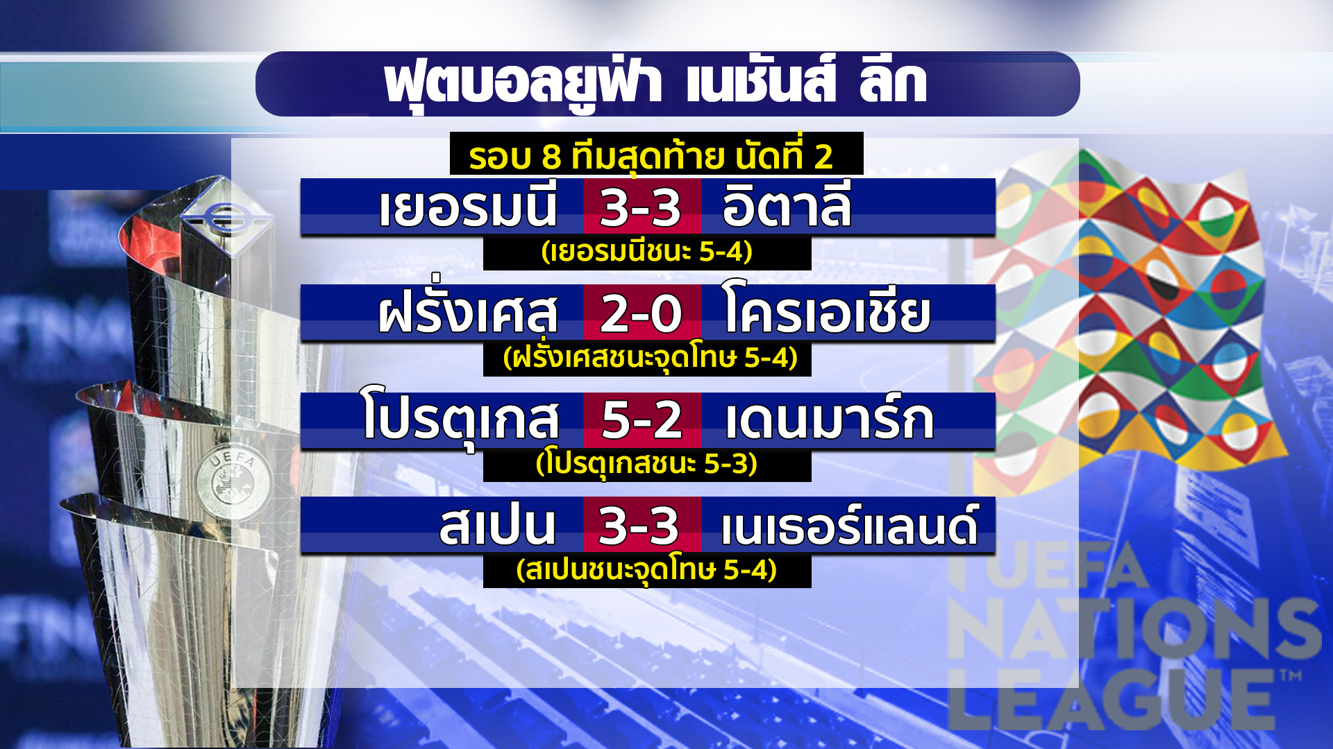 ส่วนผลคู่อื่น ๆ ยูฟ่า เนชั่นส์ ลีก รอบ 8 ทีมสุดท้าย นัดที่ 2 ฝรั่งเศส ชนะจุดโทษ โครเอเชีย 5-4 หลังในเกมฝรั่งเศสชนะ 2-0 สกอร์รวม 2 นัด เสมอกัน 2-2, โปรตุเกส ชนะ เดนมาร์ก 5-2 ในช่วงต่อเวลาพิเศษ สกอร์รวม 2 นัด โปรตุเกสชนะ 5-3, สเปน ชนะจุดโทษ เนเธอร์แลนด์ 5-4 หลังในเกมเสมอกัน 3-3 รวมผล 2 นัด เสมอกัน 5-5