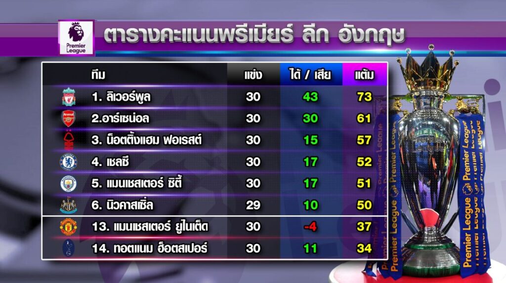 ตารางคะแนน พรีเมียร์ลีก อังกฤษ ล่าสุด “หงส์แดง” ลิเวอร์พูล รั้งจ่าฝูง แข่ง 30 นัด มี 73 คะแนน ทิ้งห่างอาร์เซนอล รองจ่าฝูง 12 คะแนน โดยเหลือโปรแกรมการแข่งขันอีก 8 นัด ซึ่งลิเวอร์พูล ต้องการชัยชนะอีก 4 เกม และเสมอ อีก 1 เกม เท่านั้น จะการันตีถ้วยแชมป์ พรีเมียร์ลีก ฤดูกาลนี้ ส่วนการแย่งพื้นที่ อันดับ 4 ของตาราง เพื่อไปเล่นในศึกฟุตบอลยูฟ่า แชมเปียนส์ลีก ยังคงขับเคี่ยวกันอย่างสนุก ระหว่าง เชลซี, แมนเชสเตอร์ ซิตี้ และนิวคาสเซิล.-สำนักข่าวไทย