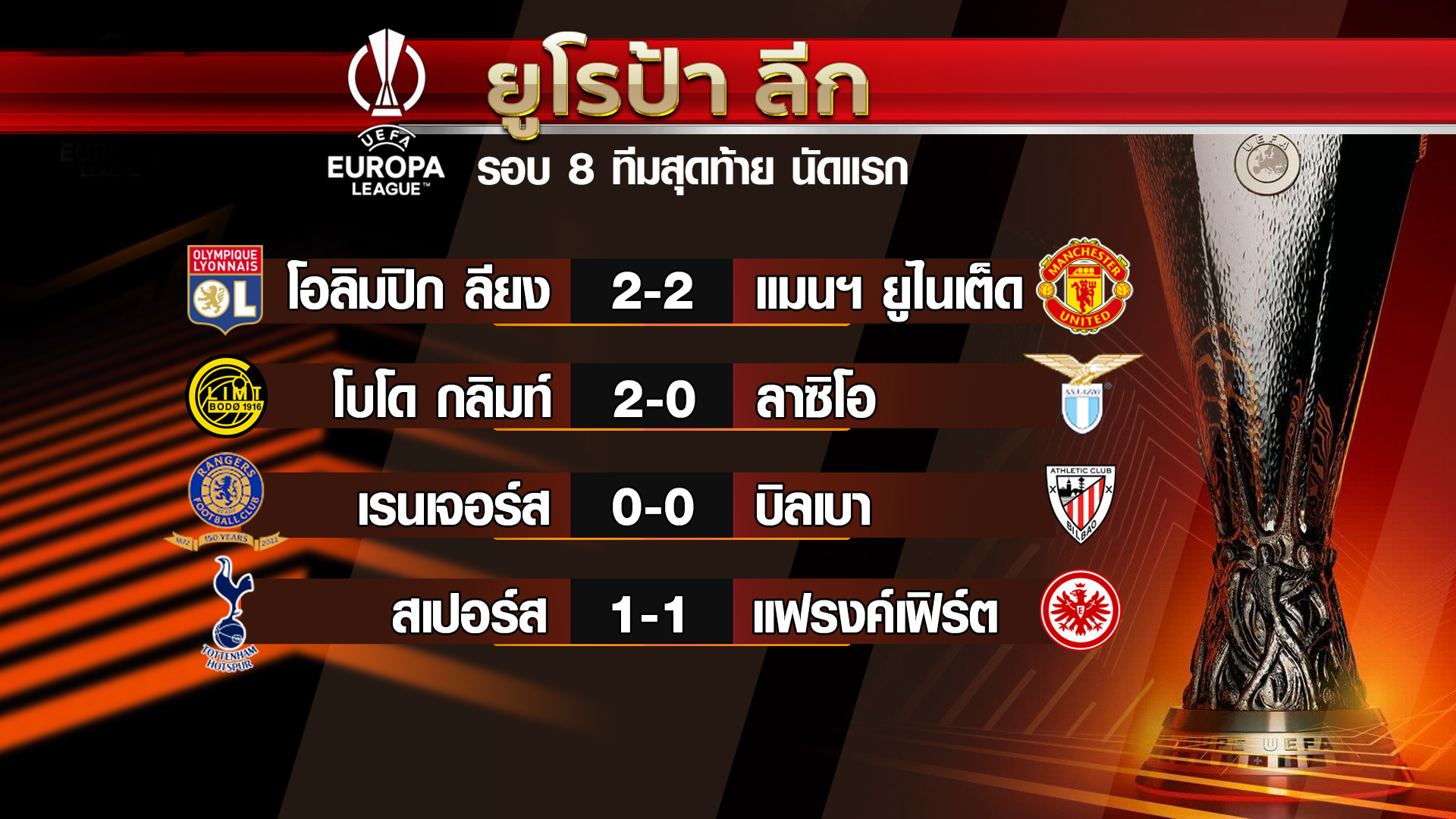 ผลฟุตบอลยูฟ่า ยูโรปา ลีก รอบ 8 ทีมสุดท้าย นัดแรก โอลิมปิก ลียง จากฝรั่งเศส เปิดบ้านพบ “ปีศาจแดง” แมนเชสเตอร์ ยูไนเต็ด จากอังกฤษ นาทีที่ 25 ติอาโก อัลมาดา เปิดฟรีคิกไปหน้าประตู บอลตกพื้นกระเด้งผ่านมือ อังเดร โอนานา นายทวารแมนฯ ยูไนเต็ด เข้าไปให้ลียง ขึ้นนำ 1-0 ก่อนที่แมนฯ ยูไนเต็ด จะตีเสมอจากลูกโหม่งของ เลนี โยโร นาทีที่ 45+5
