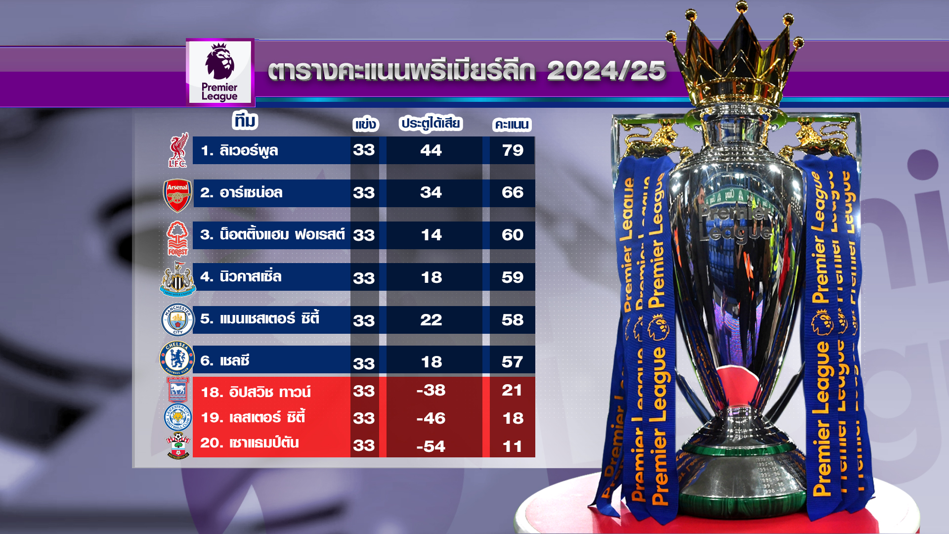 ด้านเส้นทางการลุ้นแชมป์พรีเมียร์ลีก อังกฤษ ของทีม “หงส์แดง” ลิเวอร์พูล หลังบุกไปเฉือนชนะ เลสเตอร์ ซิตี เมื่อนัดที่แล้ว ขณะนี้รั้งจ่าฝูง มี 79 คะแนน จากการลงเตะ 33 นัด ทิ้งห่าง “ปืนใหญ่” อาร์เซนอล 13 คะแนน โดยอาร์เน สล็อต ต้องพาลูกทีมคว้าชัยชนะให้ได้อีกเพียงนัดเดียวเท่านั้น จะคว้าแชมป์ไปครองได้สำเร็จ