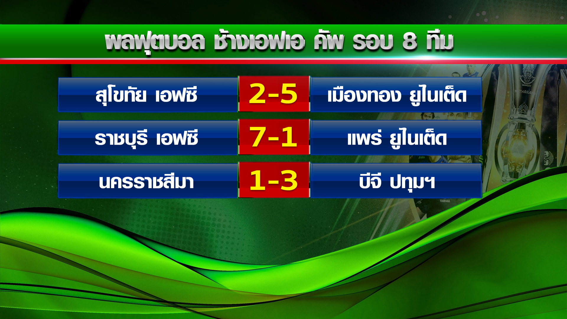 ส่วนผลคู่อื่นๆ สุโขทัย เอฟซี แพ้ เมืองทอง ยูไนเต็ด 2-5, ราชบุรี เอฟซี ชนะ แพร่ ยูไนเต็ด 7-1 .-สำนักข่าวไทย