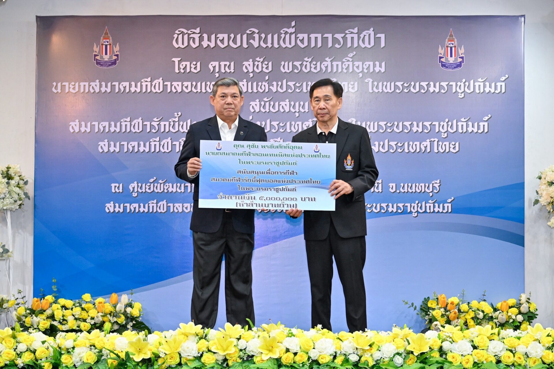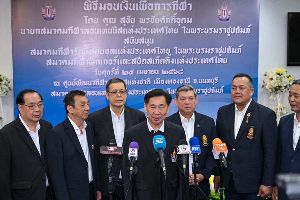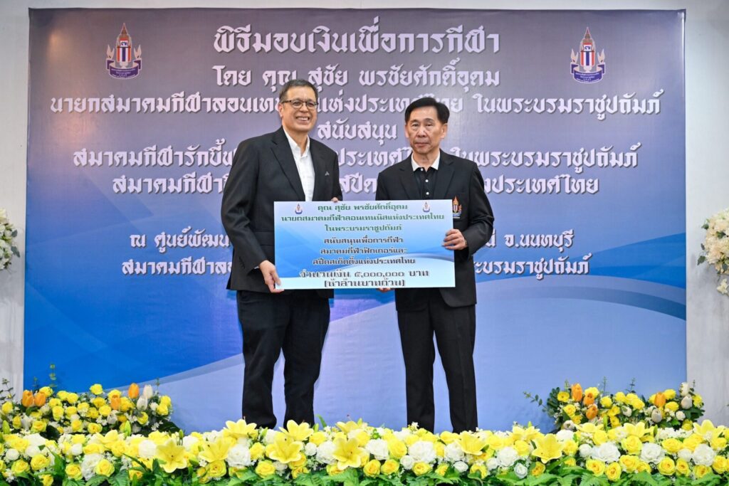 25 เม.ย.68-“บิ๊กสุชัย” นายสุชัย พรชัยศักดิ์อุดม นายกสมาคมกีฬาลอนเทนนิสแห่งประเทศไทย ในพระบรมราชูปถัมภ์ เป็นประธานในพิธีมอบเงินเพื่อการกีฬาสนับสนุน สมาคมกีฬารักบี้ฟุตบอลแห่งประเทศไทย ในพระบรมราชูปถัมภ์ และสมาคมกีฬาฟิกเกอร์และสปีดสเก็ตติ้งแห่งประเทศไทย โดยมี พ.ต.ท.กุลธน ประจวบเหมาะ นายกสมาคมกีฬารักบี้ฟุตบอลฯ และ ดร.สีหศักดิ์ อารีราชการัณย์ นายกสมาคมกีฬาฟิกเกอร์และสปีดสเก็ตติ้งฯ ร่วมรับมอบเงินสนับสนุน ซึ่งเป็นเงินส่วนตัวของ นายสุชัย ที่มอบให้สมาคมละ 5 ล้านบาท รวม 2 สมาคม เป็นจำนวนเงิน 10 ล้านบาท ที่ศูนย์พัฒนากีฬาเทนนิสแห่งชาติ สมาคมกีฬาลอนเทนนิสแห่งประเทศไทยฯ เมืองทองธานี จ.นนทบุรี