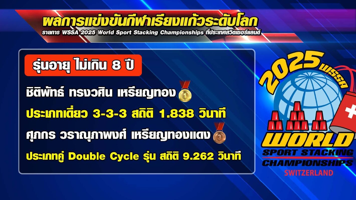 เด็กและเยาวชนไทย เข้าร่วมการแข่งขันกีฬาเรียงแก้วระดับโลก รายการ WSSA 2025 World Sport Stacking Championships ที่ประเทศสวิตเซอร์แลนด์ ปรากฏว่า ทีมไทยติดอันดับ ท็อป 10 ของโลก รั้งอันดับ 6 ของเอเชีย โดยรุ่นอายุไม่เกิน 8 ปี ชิติพัทธ์ ทรงวศิน ได้รางวัลชนะเลิศ เหรียญทอง ประเภทเดี่ยว 3-3-3 สถิติ 1.838 วินาที