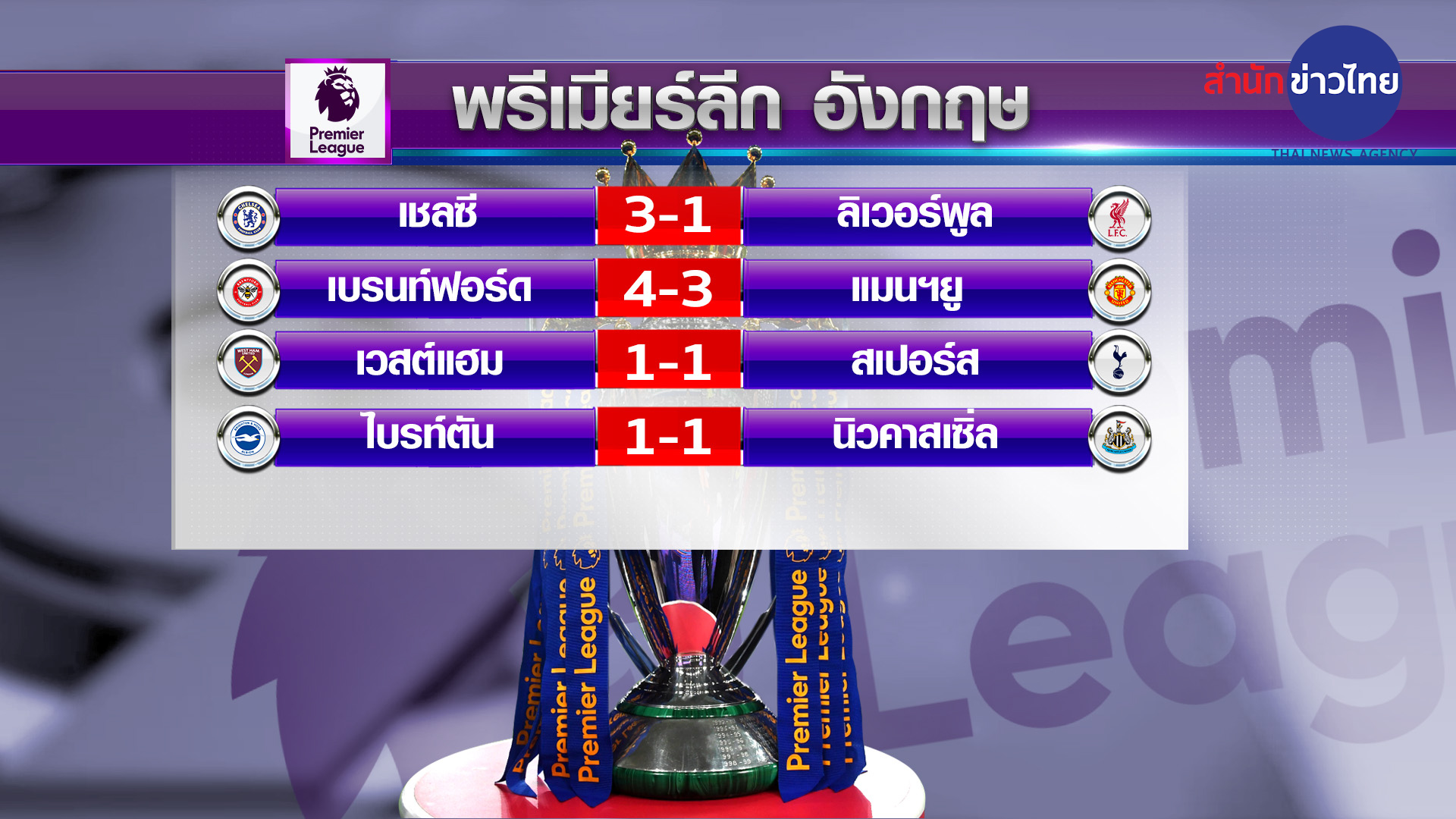 5 พ.ค.- เชลซี เปิดบ้านเอาชนะ ลิเวอร์พูล 3-1 ส่วน แมนฯ ยูไนเต็ด บุกไปพ่าย เบรนท์ฟอร์ด 3-4 ศึกพรีเมียร์ลีก อังกฤษ