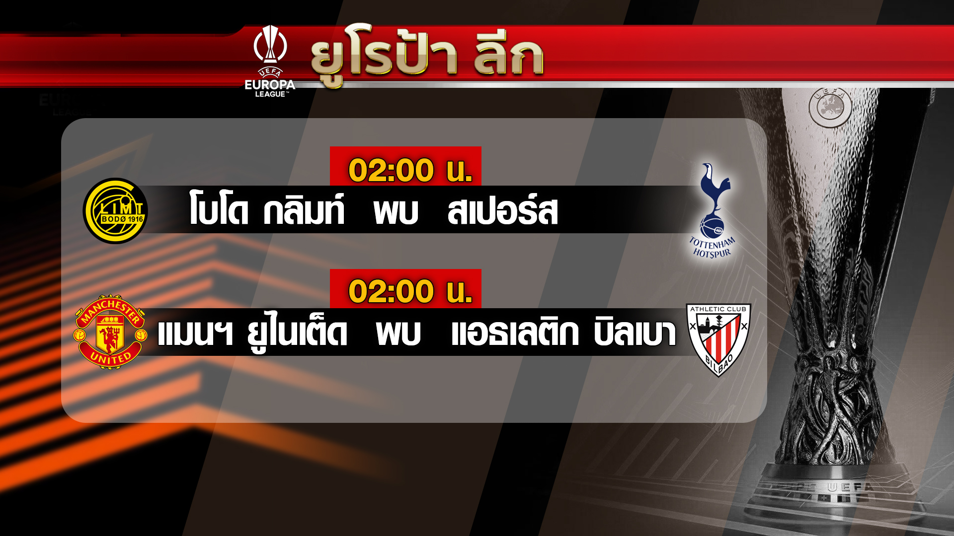 ฟุตบอลยูฟ่า ยูโรปา ลีก รอบรองชนะเลิศ นัดที่ 2 แมนฯ ยูไนเต็ด จากอังกฤษ เตรีมเปิดสนามโอลด์ แทรฟฟอร์ด พบกับแอธเลติก บิลเบา จากสเปน เวลา 02.00 น. คืนนี้