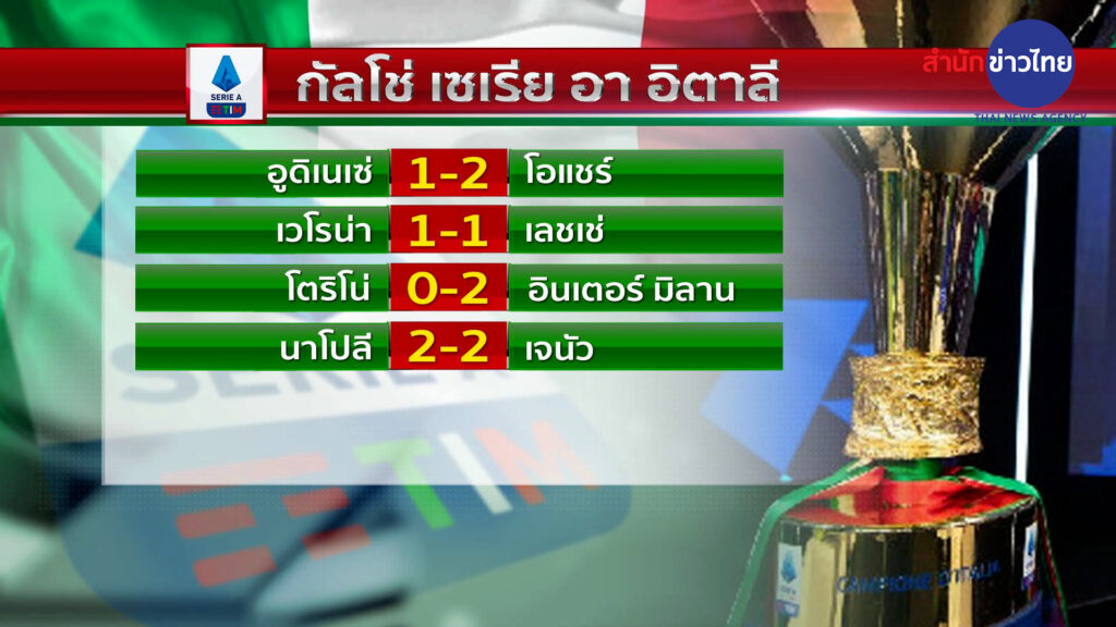 ผลฟุตบอล กัลโช่ เซเรีย อา อิตาลี อูดิเนเซ่ แพ้ มอนซ่า 1-2 เวโรน่า เสมอ เลชเช่ 1-1 โตริโน่ แพ้ อินเตอร์ มิลาน 0-2 นาโปลี เสมอ เจนัว 2-2