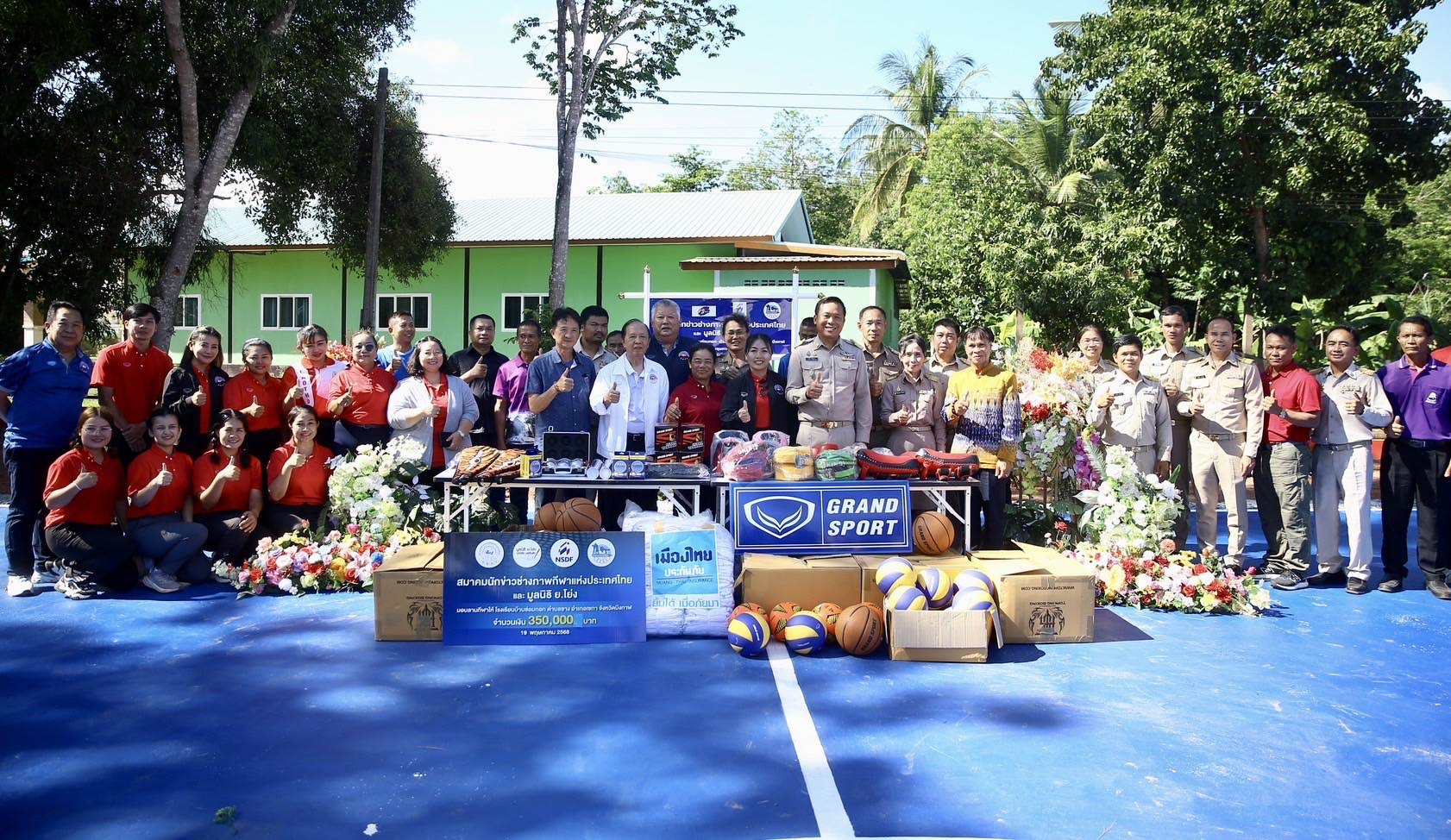 “จุดประสงค์การสร้างลานกีฬาให้กับโรงเรียนที่ขาดแคลนในจังหวัดต่างๆนั้น ก็เพื่อเป็นการเติมเต็มให้โรงเรียนที่ขาดแคลนทุนในการจัดสร้าง เพื่อให้เด็กนักเรียนได้มีสถานที่ออกกำลังกาย เล่นกีฬา รวมทั้งอุปกรณ์กีฬาที่ทันสมัย ทัดเทียมโรงเรียนที่อยู่ในเมือง ซึ่งอุปกรณ์กีฬานั้น ทางสมาคมฯก็ได้รับการสนับสนุนจาก บริษัท แกรนด์สปอร์ต กรุ๊ปรวมทั้ง มูลนิธิ”ย.โย่ง”เอกชัย นพจินดา มาโดยตลอดและในครั้งนี้ สมาคมฯ ยังได้รับการช่วยเหลือจาก บริษัท ท็อปคิงส์ ที่มอบอุปกรณ์มวยมาให้ด้วย รวมไปถึง “มาดามแป้ง”นวลพรรณ ล่ำซำ นายกสมาคมกีฬาฟุตบอล ได้มอบเสื้อให้กับนักเรียนและคณะครู ครบทุกคน”