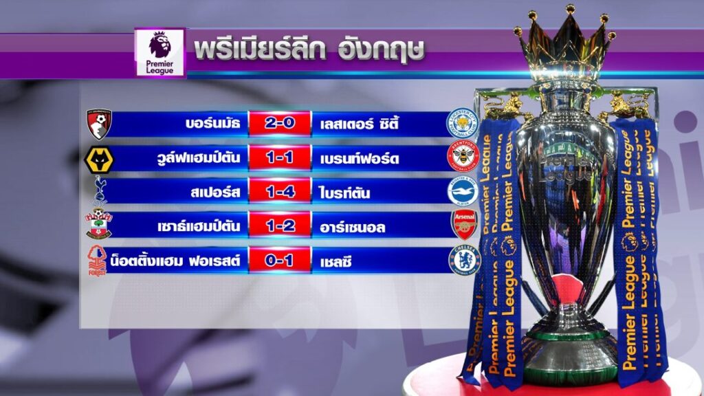 ผลพรีเมียร์ลีก อังกฤษ นัดสุดท้าย คู่อื่นๆ บอร์นมัธ ชนะ เลสเตอร์ ซิตี้ 2-0, วูล์ฟแฮมป์ตัน เสมอ เบรนท์ฟอร์ด 1-1, สเปอร์ส แพ้ ไบรท์ตัน 1-4, เซาธ์แฮมป์ตัน แพ้ อาร์เซนอล 1-2, นอตติงแฮม ฟอเรสต์ แพ้ เชลซี 0-1, นิวคาสเซิล แพ้ เอฟเวอร์ตัน 0-1, แมนฯ ยูไนเต็ด ชนะ แอสตัน วิลลา 2-0, ฟูแล่ม แพ้ แมนฯ ซิตี้ 0-2 และ อิปสวิช ทาวน์ แพ้ เวสต์แฮม 1-3