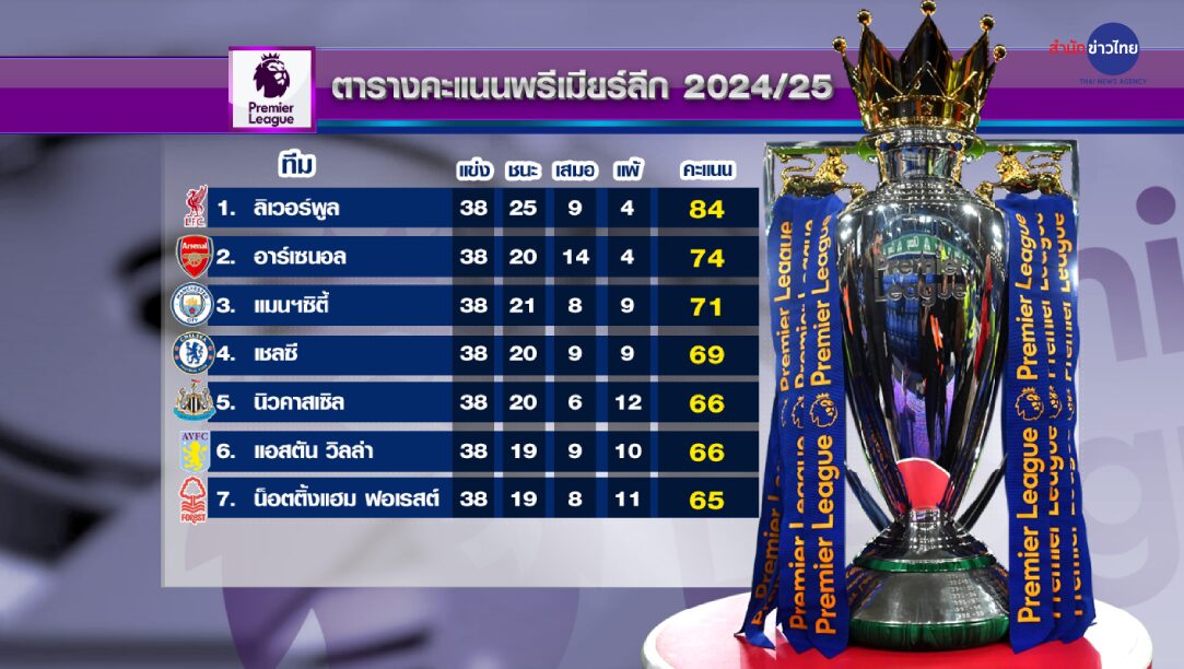 ผลฟุตบอลพรีเมียร์ลีก อังกฤษ นัดสุดท้ายของฤดูกาล 2024/25 “หงส์แดง” ลิเวอร์พูล ที่คว้าแชมป์ลีกสูงสุดไปครองเป็นสมัยที่ 20 แน่นอนแล้ว เปิดสนามแอนด์ฟิลด์ พบ คริสตัล พาเลซ แชมป์เอฟเอ คัพ ก่อนเกมทั้ง 2 ทีมต่างยืนตั้งแถวปรบมือให้กันและกัน เพื่อเป็นการให้เกียรติและชื่นชมที่ต่างคว้าแชมป์มาครอง เกมนี้ พาเลซ ช็อกแฟนเจ้าถิ่นขึ้นนำก่อน 1-0 ในนาทีที่ 9 จากอิสไมลา ซาร์ จากนั้นนาทีที่ 68 ลิเวอร์พูล เหลือผู้เล่นแค่ 10 คน เมื่อไรอัน กราเฟนแบร์ก โดนใบแดง แม้จะเหลือผู่เล่นน้อยกว่า แต่ ลิเวอร์พูล ตามตีเสมอเป็น 1-1 จาก โมฮาเหม็ด ซาลาห์ ในนาทีที่ 85 จบเกม “หงส์แดง” เสมอ พาเลซ 1-1 คว้าแชมป์ไปครองโดยมี 84 คะแนนจาก 38 นัด ส่วน พาเลซ มี 53 คะแนนจบอันดับที่ 12