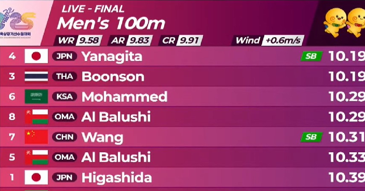 การแข่งขันกรีฑาชิงแชมป์เอเชีย ครั้งที่ 26 ที่เมืองกูมิ ประเทศเกาหลีใต้ รายการวิ่ง 100 เมตรชาย รอบชิงชนะเลิศ มีนักกีฬา 8 คน เป็นการขับเคี่ยวกันของ “บิว” ภูริพล บุญสอน นักวิ่งทีมชาติไทย วัย 19 ปี เจ้าของเหรียญเงินเอเชียนเกมส์ ครั้งล่าสุด ในช่องวิ่งที่ 3 เสื้อสีน้ำเงิน กับ ฮิโรกิ ยานากิตะ ลมกรดแชมป์เก่าจากญี่ปุ่น ในช่องวิ่งที่ 4 ปรากฏว่าสองคนสับเท้าเร่งสปีดได้อย่างสูสี ยานากิตะ ออกนำบิวไปได้เล็กน้อย ก่อนบิวจะเร่งในช่วง 10 เมตรสุดท้าย เข้าเส้นชัยแทบจะพร้อมกัน