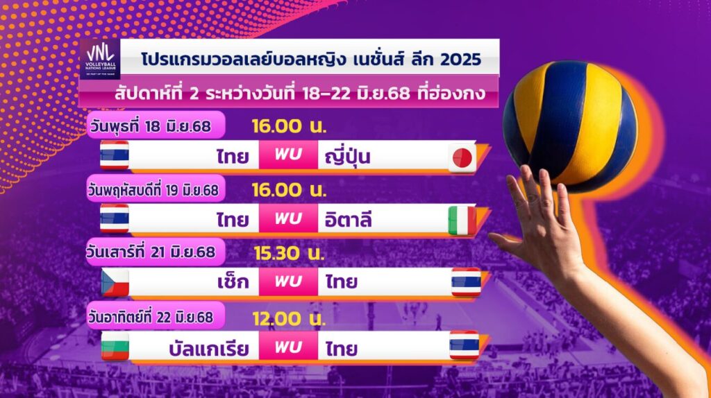 ทีมวอลเลย์บอลหญิงทีมชาติไทยทั้ง 16 คน ออกเดินทางจากท่าอากาศยานสุวรรณภูมิ ไปยังเขตบริหารพิเศษฮ่องกง เตรียมสู้ศึกวอลเลย์บอลหญิง เนชันส์ ลีก 2025 หรือ VNL 2025 สัปดาห์ที่ 2 ระหว่างวันที่ 18–22 มิถุนายน โดยมี “เพียว” อัจฉราพร คงยศ กัปตันทีม นำทัพ พร้อมด้วย “ชมพู่”พรพรรณ เกิดปราชญ์, “บุ๋มบิ๋ม”ชัชชุอร โมกศรี, “บีม” พิมพิชยา ก๊กรัมย์, “แนน”ทัดดาว นึกแจ้ง, “แป้น”ปิยะนุช แป้นน้อย ภายใต้การคุมทีมของ “โค้ชอ๊อต” เกียรติพงษ์ รัชตเกรียงไกร หัวหน้าผู้ฝึกสอน