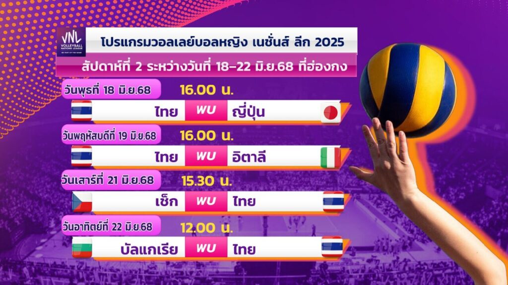 ฮ่องกง 17 มิ.ย. – ทีมลูกยางสาวไทย พร้อมดวล ญี่ปุ่น ในศึกวอลเลย์บอลหญิง เนชันส์ ลีก สัปดาห์ที่ 2 วันพรุ่งนี้ (18 มิ.ย.)