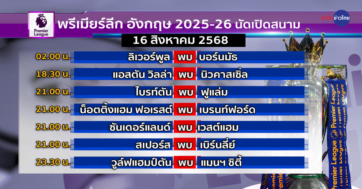 ในวันอาทิตย์ที่ 17 สิงหาคม มีเตะอีก 2 คู่ เชลซี พบ คริสตัล พาเลซ ขณะที่ “ปีศาจแดง” แมนเชสเตอร์ ยูไนเต็ด ต้องทำศึกหนักตั้งแต่เกมแรก โดยจะเปิดบ้านรับการมาเยือน “ปืนใหญ่” อาร์เซนอล ทีมรองแชมป์ฤดูกาลล่าสุด และลีดส์ พบ เอฟเวอร์ตัน เวลา 02.00 ของวันที่ 18 สิงหาคม สำหรับศึกแดงเดือด เกมแรกลิเวอร์พูล จะเปิดแอนฟิลด์ เจอกับ แมนฯ ยูไนเต็ด ในวันที่ 18 ตุลาคม .-สำนักข่าวไทย