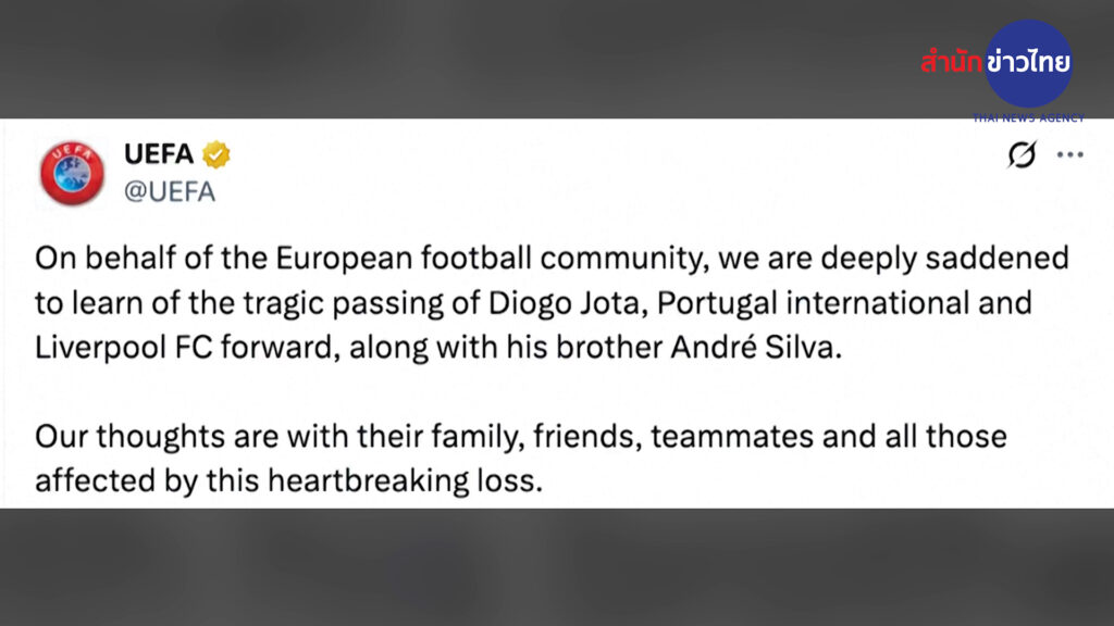 ยูฟ่าโพสต์ว่า เรารู้สึกเสียใจอย่างสุดซึ้งเมื่อทราบข่าวการเสียชีวิตของ ดิโอโก้ โชต้า กองหน้าทีมชาติโปรตุเกสและสโมสรลิเวอร์พูล พร้อมด้วยน้องชายของเขา เราขอส่งความอาลัยไปยังครอบครัว เพื่อน เพื่อนร่วมทีม และทุกคนที่ได้รับผลกระทบจากการสูญเสียอันน่าสลดใจครั้งนี้