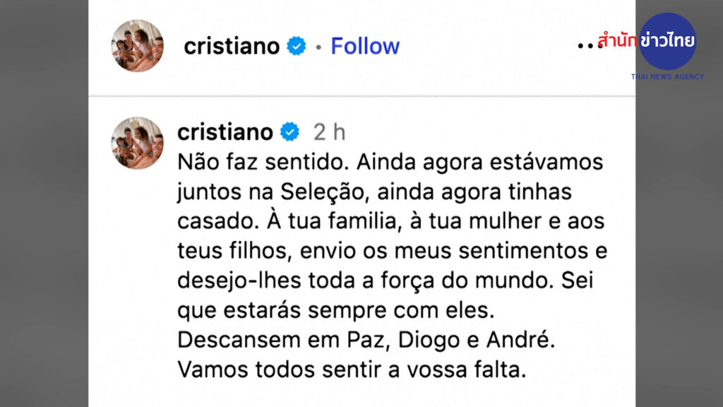 คริสเตียโน โรนัลโด ซูเปอร์สตาร์เพื่อนร่วมทีมชาติ โพสต์อาลัยถึงโชต้าว่า มันไม่สมเหตุสมผลเลย เราเพิ่งร่วมทีมชาติด้วยกัน ตอนที่คุณแต่งงานแล้ว ขอแสดงความเสียใจกับครอบครัวของคุณ ภรรยา และลูกๆ ของคุณ ขอให้ทุกคนเข้มแข็งไว้ ฉันรู้ว่าคุณจะอยู่กับพวกเขาเสมอ ขอให้ไปสู่สุคติ ดิโอโก้ และอังเดร พวกเราทุกคนจะคิดถึงคุณ