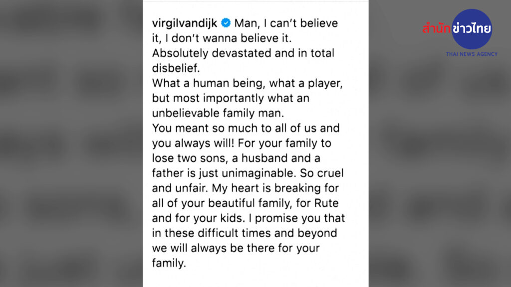 เฟอร์จิล ฟาน ไดค์ กัปตันทีมหงส์แดง ออกมาแสดงความเสียใจผ่านโซเชียลมีเดียว่า เพื่อน ฉันไม่อยากเชื่อเลย มันน่าเศร้าเหลือเกิน นายป็นคนดี เป็นนักเตะที่ยอดเยี่ยม ที่สำคัญเป็นคนรักครอบครัวมาก สำหรับครอบครัวเป็นการสูญเสียสามีและพ่อของลูก 2 คน มันยากเกินจะจินตนาการ ช่างโหดร้ายและไม่ยุติธรรม นายคือแชมเปียนส์ และหมายเลข 20 จะอยู่ในความทรงจำของทุกคนตลอดกาล สำหรับพิธีศพของโชต้า และน้องชาย จะจัดขึ้นที่โปรตุเกส ในวันเสาร์นี้ .-สำนักข่าวไทย