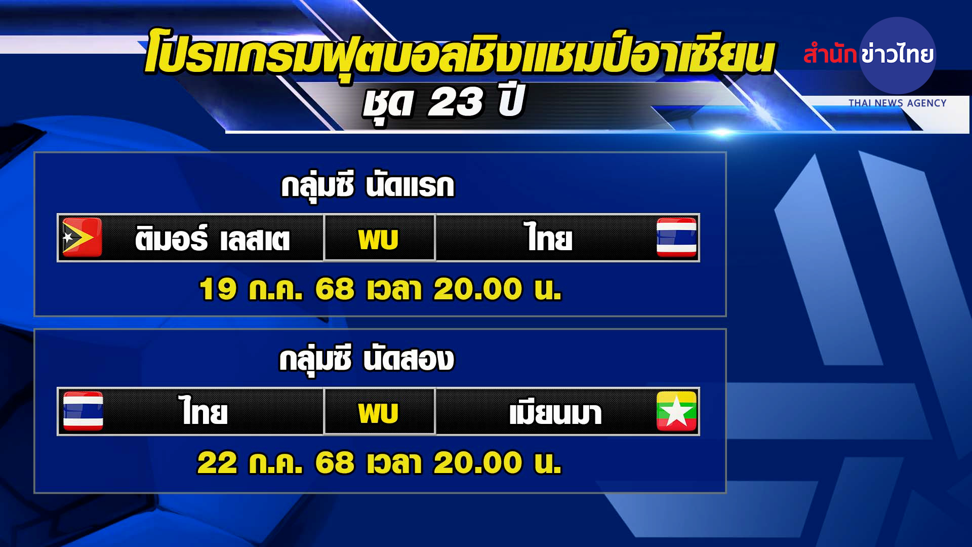 กลุ่มซี นัดแรกติมอร์ เลสเต พบ ไทย 19 ก.ค. เวลา 20.00 น. นัดสอง ไทย พบ เมียนมา 22 ก.ค. เวลา 20.00 น.โดยการแข่งขันรอบแบ่งกลุ่มจะนำทีมแชมป์กลุ่มทั้งสามกลุ่ม และอันดับ 2 ที่ผลงานดีที่สุด 1 จาก 3 กลุ่มผ่านเข้ารอบต่อไป -สำนักข่าวไทย