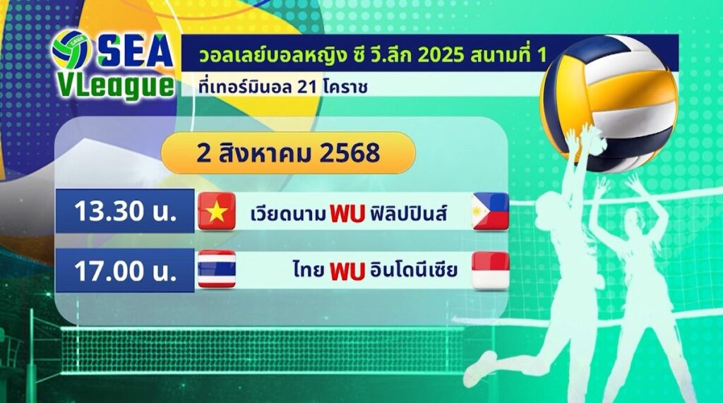 โปรแกรมการแข่งขันนัดที่ 2 ของ ทีมตบสาวไทย พบ อินโดนีเซีย เย็นวันนี้ เวลา 17.00 น. ส่วนคู่แรก เวียดนาม พบ ฟิลิปปินส์ เวลา 13.30 น.-สำนักข่าวไทย