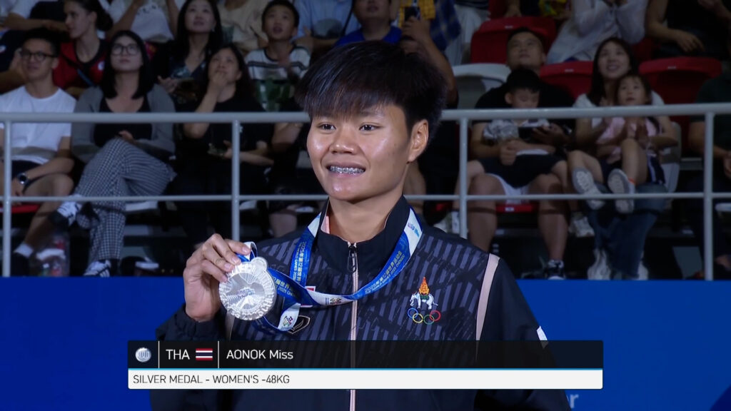 มวยไทยสมัครเล่น รุ่น 48 กก.หญิง รอบชิงชนะเลิศ กุลณัฐ อ่อนอก หรือ “น้องนุ๊ก มกช.ชัยภูมิ” นักชกสาวไทย มุมน้ำเงิน พบกับ ลุย เซีย ฮุย จากเจ้าภาพจีน เกมการชกของคู่นีกุลณัฐ ออกแข้งซ้ายสลับขวาสลับกับการปล้ำตีเข่า แต่สาวจีนอาศัยเดินเข้าหาเข้าคลุกวงใน ท่ามกลางเชียร์จากเพื่อนร่วมชาติ ครบ 3 ยก กุลณัฐ แพ้ไปแบบค้านสายตา 27-30 คะแนนได้เพียงแค่เหรียญเงินเท่านั้น
