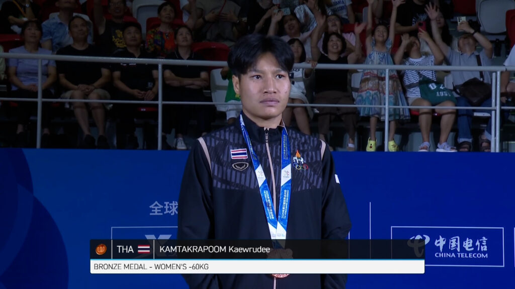 รุ่น 60 กก.หญิง รอบชิงเหรียญทองแดง แก้วฤดี คำถากระปุ่ม หรือ “จอมยุทธเหยิน จ่าแบงค์ดอนเมือง” มุมแดงออกอาวุธครบเครื่อง ทั้งหมัด เท้า เข่า ศอก ครบ 3 ยกเอาชนะคะแนน มาเรียน่า เบสปาโลว่า จากรัสเซีย 29-28 คะแนน คว้าเหรียญทองแดง