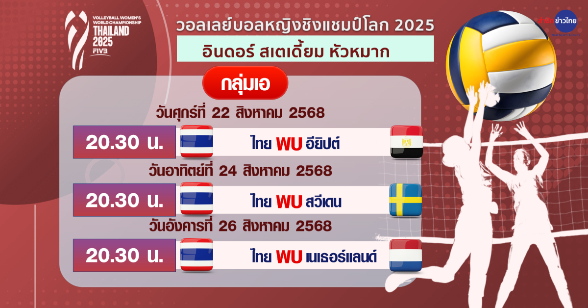 ศึกวอลเลย์บอลหญิงชิงแชมป์โลก 2025 จัดการแข่งขันระหว่างวันที่ 22 ส.ค.-7 ก.ย.นี้ ไทยจะเป็นเจ้าภาพ 4 สนาม ที่จังหวัดเชียงใหม่ นครราชสีมา ภูเก็ต และกรุงเทพมหานคร
