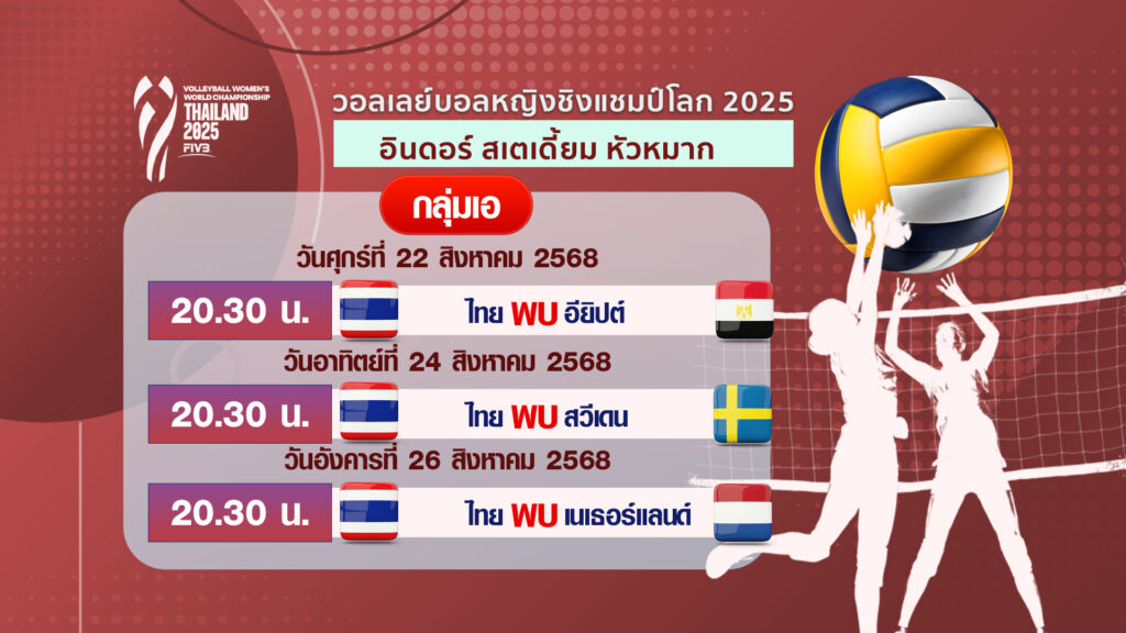 โปรแกรมของทีมสาวไทย รอบแรก กลุ่มเอ แข่งที่อินดอร์ สเตเดียม หัวหมาก วันศุกร์ที่ 22 สิงหาคม เวลา 20.30 น. พบอียิปต์, วันอาทิตย์ที่ 24 สิงหาคม เวลา 20.30 น. พบสวีเดน และวันอังคารที่ 26 สิงหาคม เวลา 20.30 น. พบเนเธอร์แลนด์.-สำนักข่าวไทย