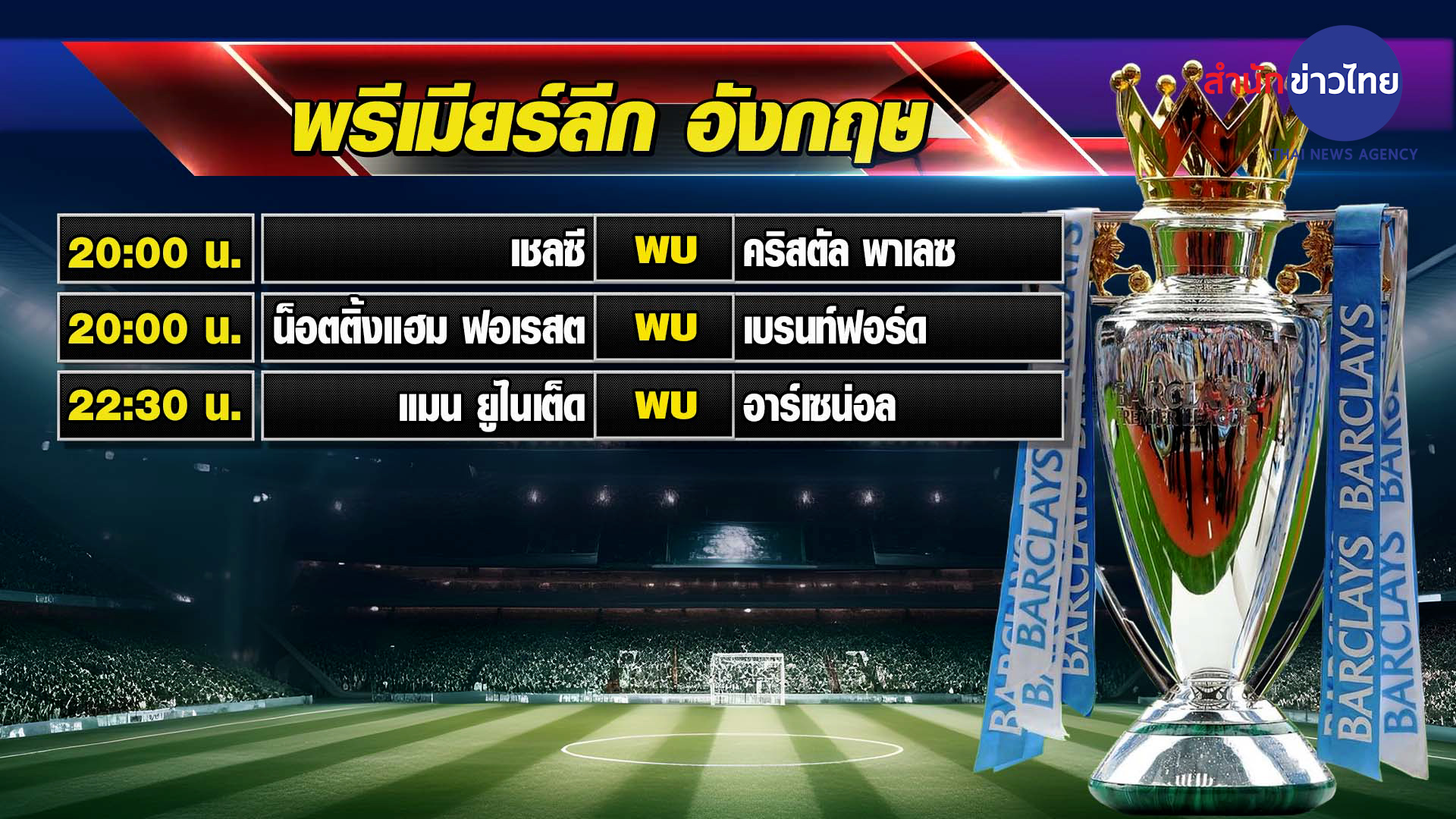 ฟุตบอลพรีเมียร์ลีก อังกฤษ คืนนี้ มีเตะ 3 คู่ เริ่มเวลา 20.00 น. เชลซี พบ คริสตัล พาเลซ และนอตติงแฮม ฟอเรสต์ พบ เบรนท์ฟอร์ด ส่วนคู่บิ๊กแมตช์ 22.30 น. แมนฯ ยูไนเต็ด พบ อาร์เซนอล