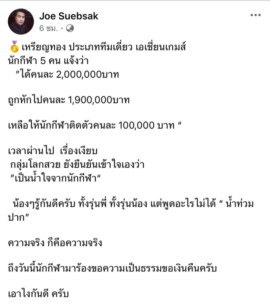 พ.ต.ท.สืบศักดิ์ ผันสืบ อดีตนักตะกร้อทีมชาติไทย อดีตเจ้าของ 7 เหรียญทองเอเชียนเกมส์ ในปี 1998 ที่กรุงเทพฯ 2 เหรียญ, ปี 2002 ที่ปูซาน เกาหลีใต้ 2 เหรียญ, ปี 2006 ที่กรุงโดฮา กาตาร์ 2 เหรียญ และในปี 2010 ที่กวางโจว ประเทศจีน 1 เหรียญ ปัจจุบันเป็นผู้จัดการทีมเซปักตะกร้อหญิงทีมชาติไทย ได้โพสต์เฟซบุ๊กส่วนตัว Joe Suebsak เกี่ยวกรณีนักกีฬาได้เงินรางวัลไม่เป็นธรรมโดยได้โพสต์ ระบุว่า “เหรียญทอง ประเภททีมเดี่ยว เอเชียนเกมส์นักกีฬา 5 คนแจ้งว่า ได้คนละ 2,000,000 บาท ถูกหักไปคนละ 1,900,000 บาท เหลือให้นักกีฬาติดตัวคนละ 100,000 บาท เวลาผ่านไปเรื่องเงียบ”