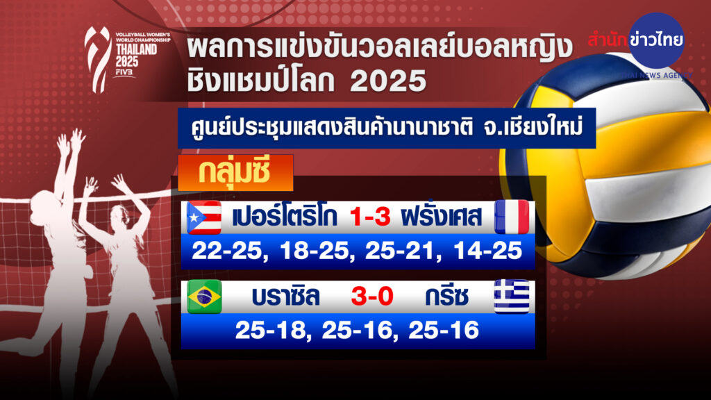 กลุ่มซี แข่งที่ศูนย์ประชุมแสดงสินค้านานาชาติ จ.เชียงใหม่ เปอร์โตริโก แพ้ ฝรั่งเศส 1-3 เซต 22-25, 18-25 , 25-21 , 14-25และ บราซิล ชนะ กรีซ 3-0 เซต 25-18, 25-16, 25-16