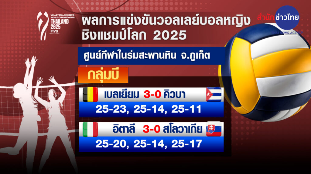 กลุ่มบีแข่งที่ศูนย์กีฬาในร่มสะพานหิน จ.ภูเก็ต เบลเยียม ชนะ คิวบา 3-0 เซต 25-23 ,25-14 ,25-11และ อิตาลี ชนะ สโลวาเกีย 3-0 เซต25-20 , 25-14, 25-17