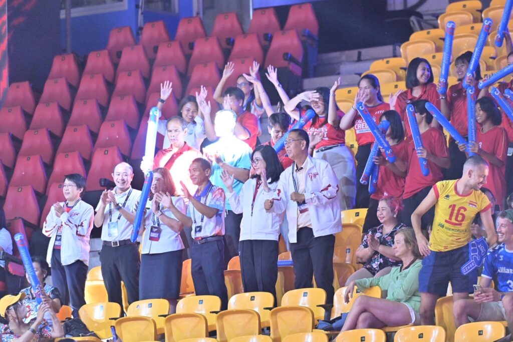 จากนั้น ปลัดกระทรวงท่องเที่ยวฯ และผู้ว่าฯ จังหวัดนครราชสีมาได้ร่วมชมการแข่งขันวอลเลย์บอลระหว่างทีมชาติแคนาดา-สเปน บรรยากาศเป็นไปอย่างคึกคัก ผู้เข้าร่วมชมการแข่งขันทั้งชาวไทยและชาวต่างชาติต่างส่งเสียงเชียร์ทีมที่ตัวเองรัก โดยช่วงพักครึ่งมีการเปิดเพลง “To Be The Champion เสียงเชียร์ เพื่อแชมป์” ซึ่งเป็นเพลงประจำการแข่งขันครั้งนี้ ปลัดกระทรวงท่องเที่ยว และผู้ว่าราชการจ.นครราขสีมา จึงได้ชวนทีมงาน และกองเชียร์ทั้งชาวไทยและชาวต่างชาติลุกขึ้นเต้นสนุกไปกับการเชียร์เพื่อร่วมกิจกรรมของสหพันธ์วอลเลย์บอลนานาชาติ (FIVB) ด้วย
