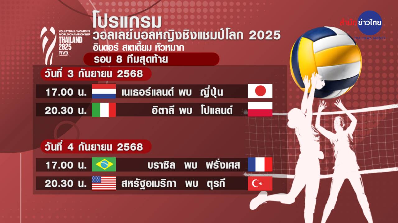 อินดอร์ สเตเดียม หัวหมาก 3 ก.ย. – ศึกวอลเลย์บอลหญิงชิงแชมป์โลก 2025 รอบ 8 ทีมสุดท้าย วันนี้ มีแข่ง 2 คู่ เนเธอร์แลนด์ พบ ญี่ปุ่น และ อิตาลี พบ โปแลนด์ ส่วนนักตบลูกยางสาวทีมชาติไทย จบอันดับที่ 13