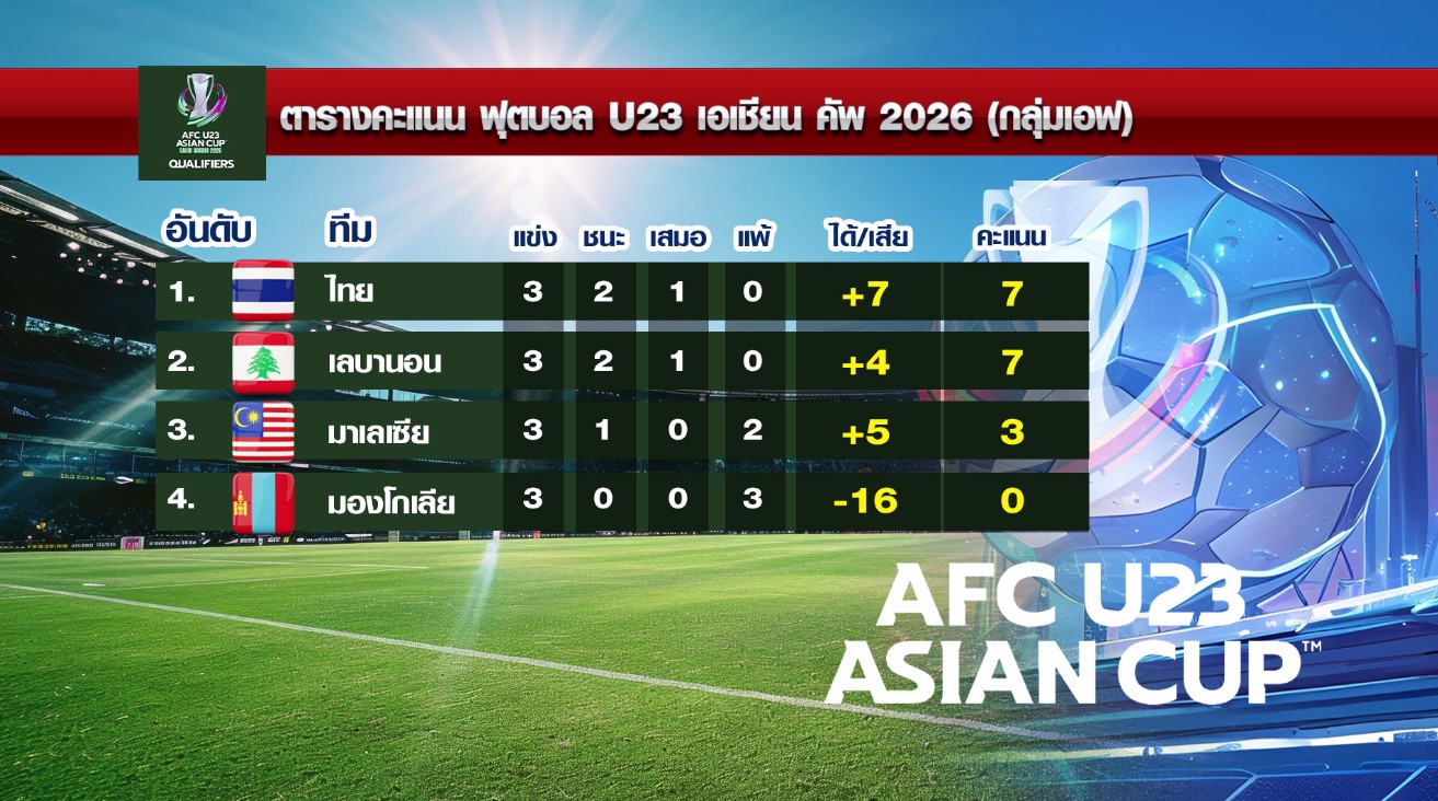 ทีมฟุตบอลทีมชาติไทยชุด 23 ปี ผ่านเข้าสู่รอบสุดท้าย ฟุตบอลเอเชียน คัพ 2026 ได้สำเร็จ หลังลงแข่งขันในนัดชี้ชะตากับมาเลเซีย และเฉือนเอาชนะไปได้ 2-1 จาก 2 ประตูของ คคนะ คำยก นักฟุตบอลดาวรุ่งยอดเยี่ยมไทยลีกปีล่าสุด โดยเฉพาะประตูชัยที่มาในนาทีที่ 90+2