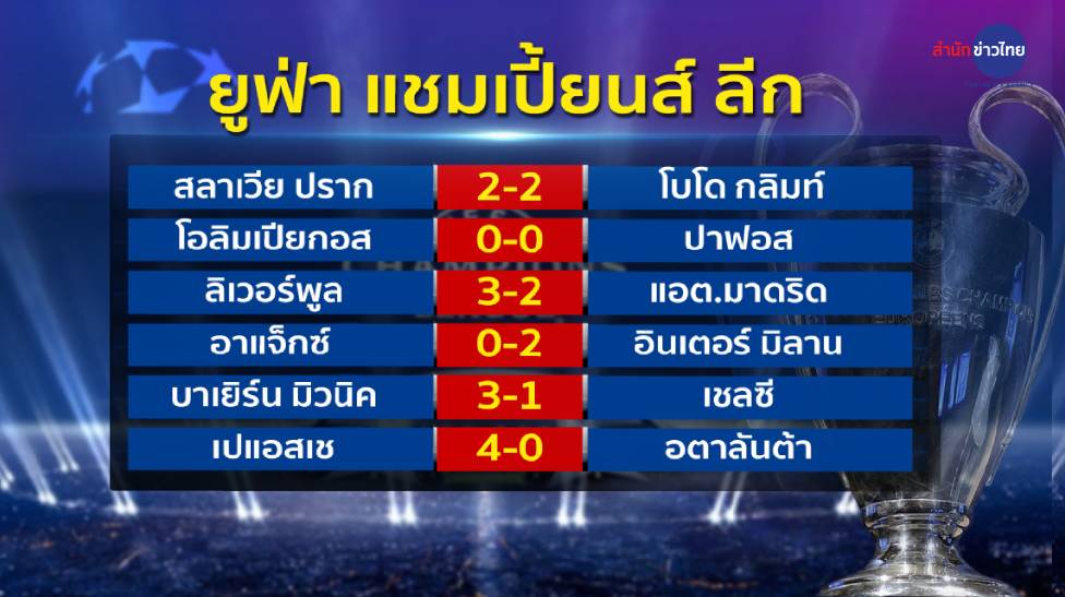 ผลฟุตบอลยูฟ่า แชมเปียนส์ ลีก รอบลีก เฟส นัดแรก แชมป์เก่า เปแอสเช จ่าฝูงลีกเอิง ฝรั่งเศส เปิดสนามพาร์ค เดส์ แพร็งซ์ ถล่มเอาชนะ อตาลันต้า จากอิตาลี 4-0 ได้ประตูจาก มาร์กินญอส นาทีที่ 3, ควิชา ควารัตส์เคเลีย นาที 39, นูโน เมนเดส นาทีที่ 51 และ กอนคาโล รามอส ในช่วงทดเวลาการแข่งขัน นาทีที่ 90+1 ช่วยให้ เปแอสเช ประเดิมเก็บ 3 แต้ม ก่อนที่นัดต่อไปพวกเขาจะบุกเยือน บาร์เซโลนา ในอีก 2 สัปดาห์ข้างหน้า